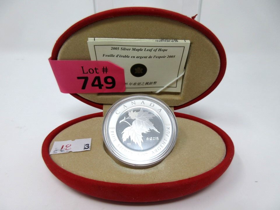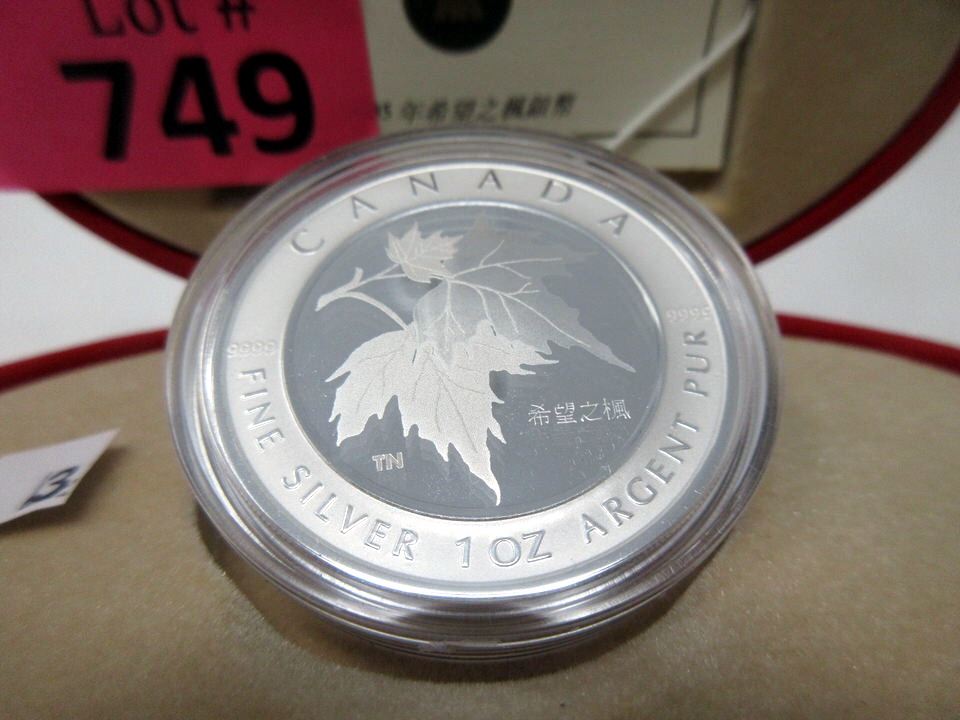Chinese Characters spell "Maple Leaf of Hope" on the coin. 1 Troy Ounce. Includes mint certificate. Tax exempt.
