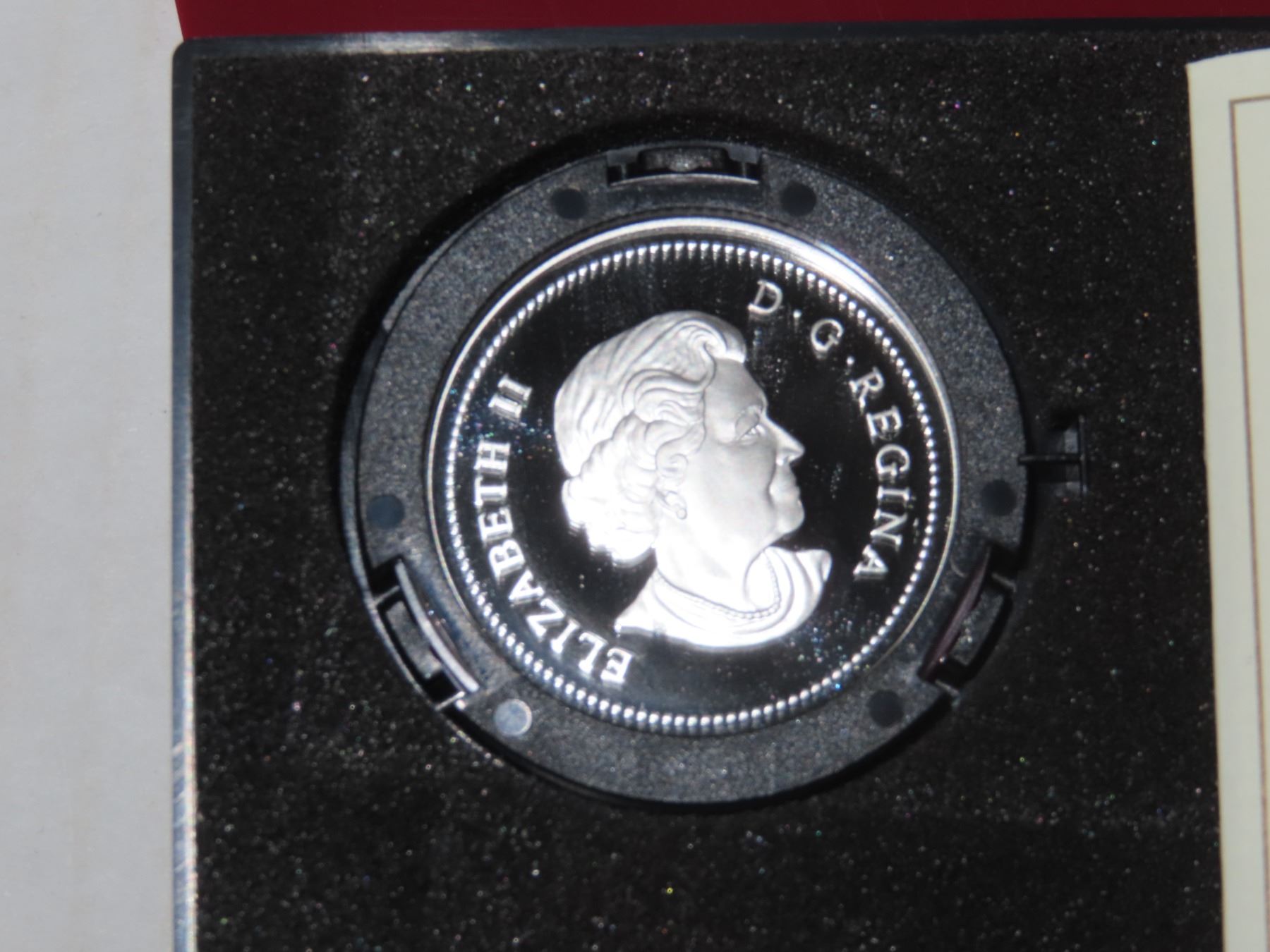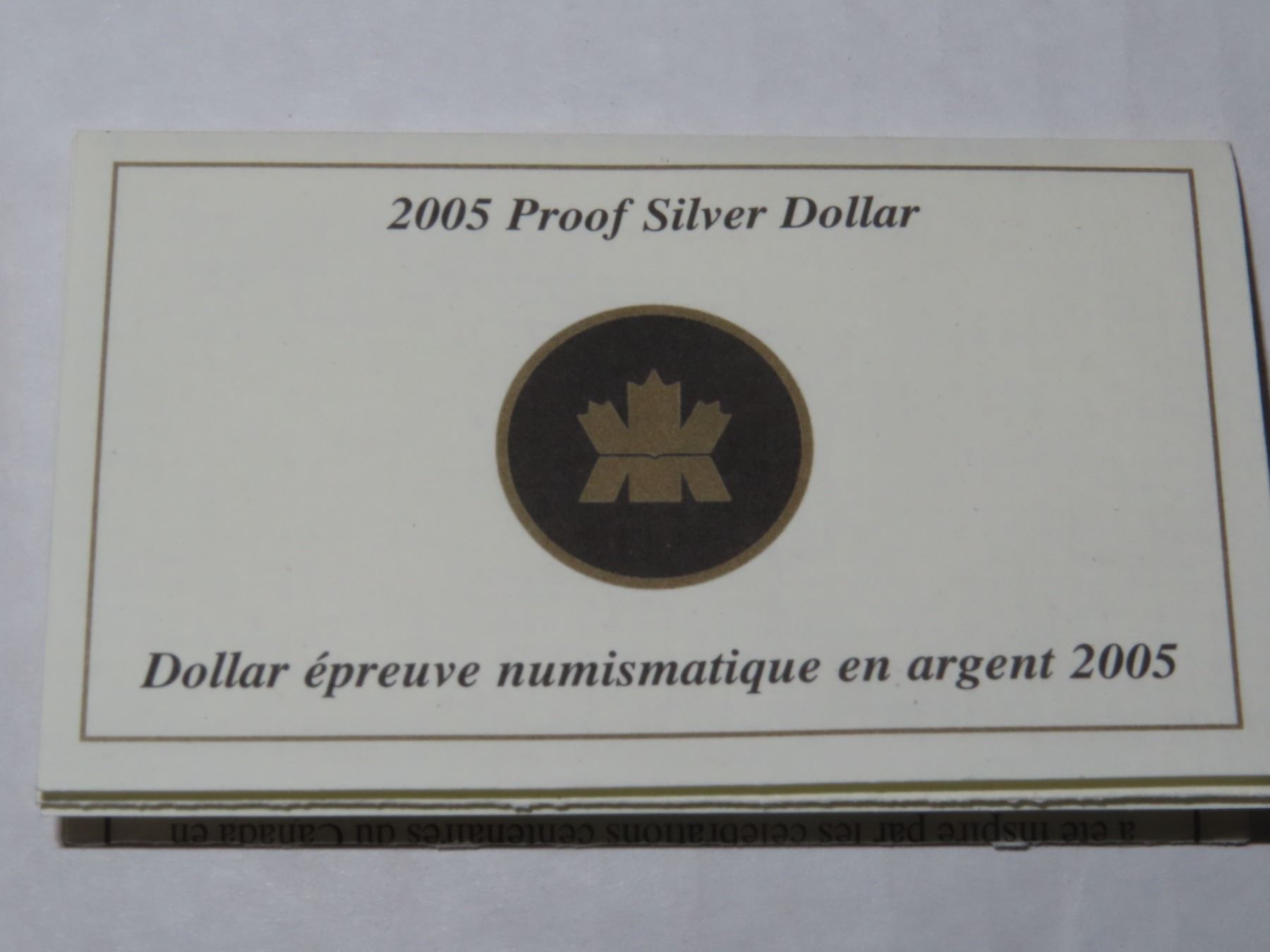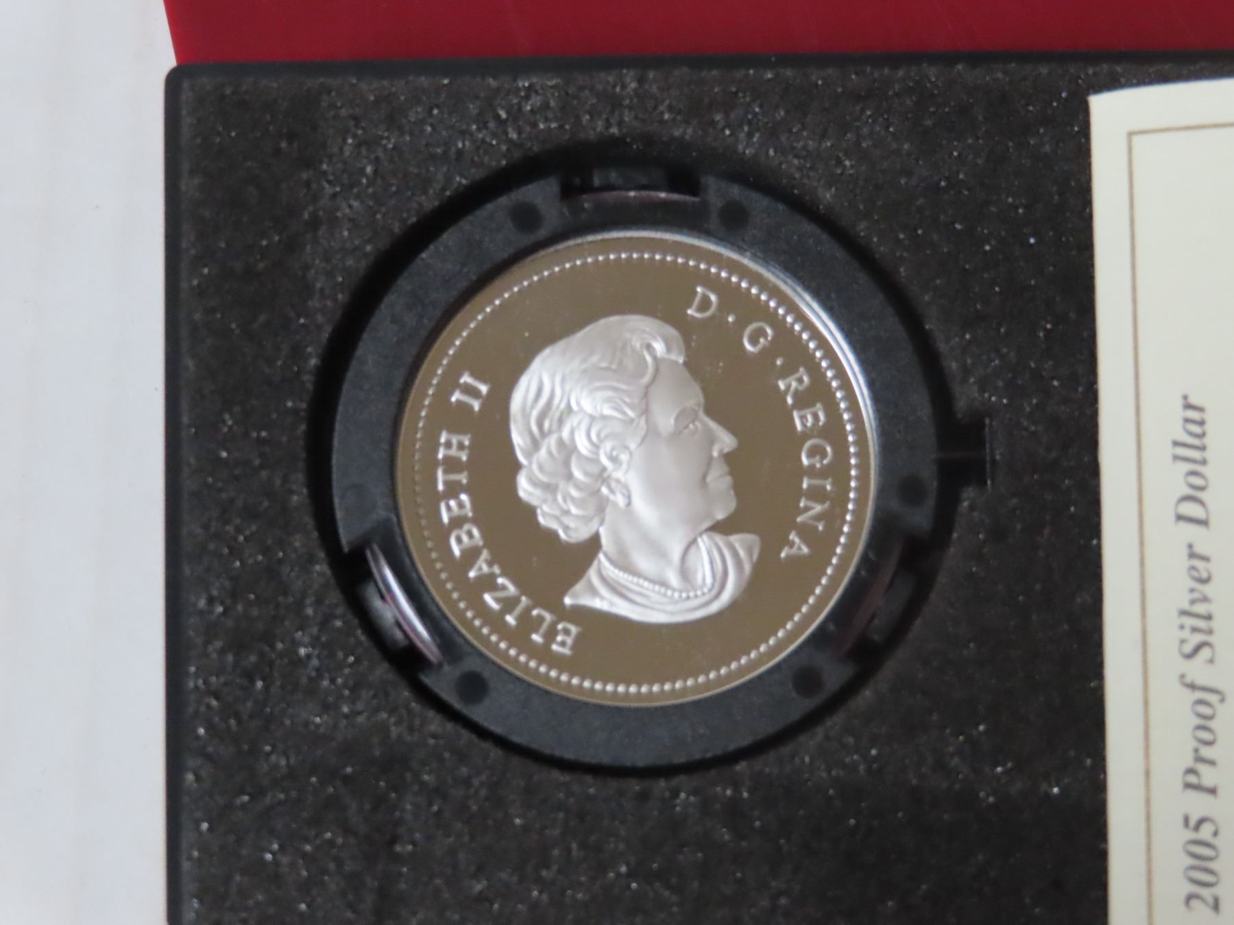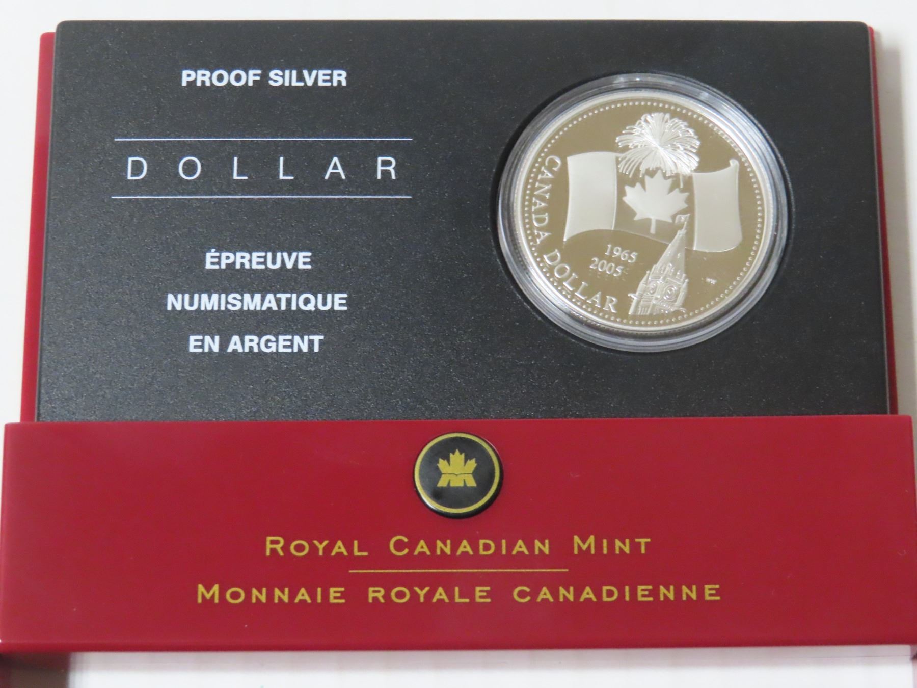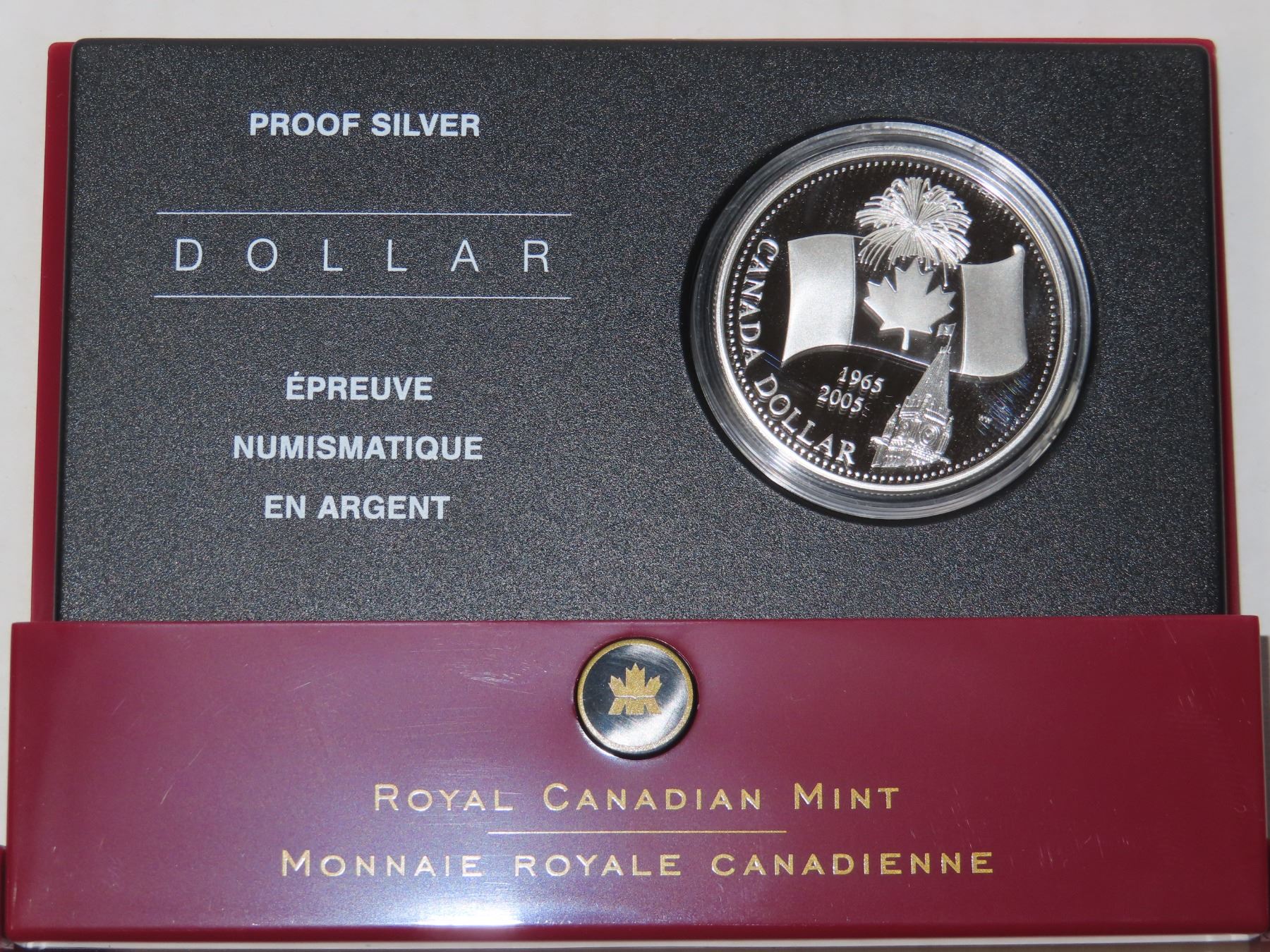 2005 Canadian Silver Dollar. Commemorates the 40th Anniversary of the Canadian Flag. 99.99% pure Silver. Proof with Ultra Heavy Cameo. Housed in its original case & box of issue.
