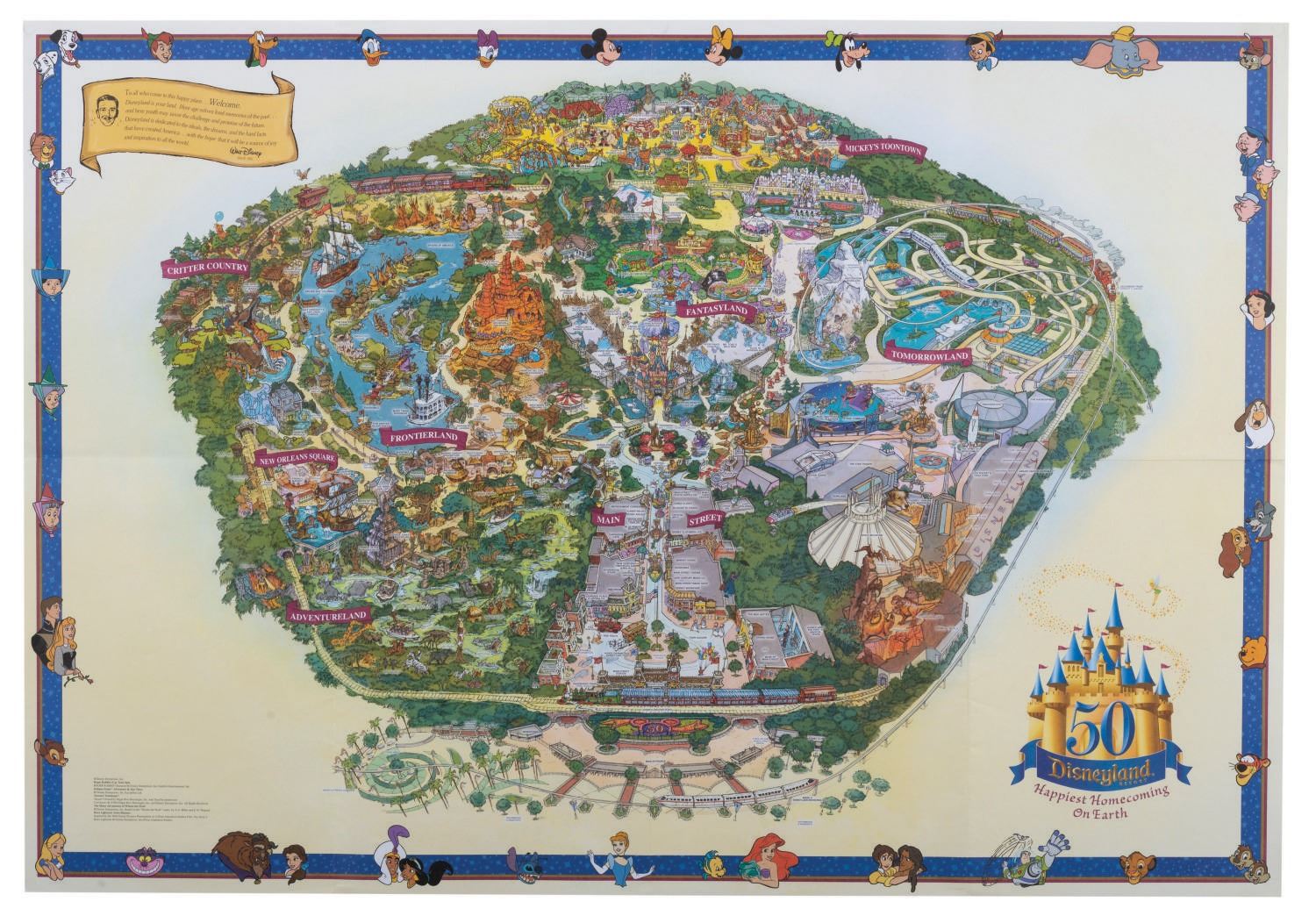 (Disneyland, 2005) A large souvenir map of Disneyland from 2005. This map features the Disneyland 50th Anniversary emblem in the lower right-hand corner, as well as the anniversary "50" in the Floral Mickey at the Park's entrance. The map also features the first appearance of "Big Thunder Ranch" and "Buzz Lightyear Astro Blasters". Measuring 27"x39", the map is in very good condition with light wear overall.