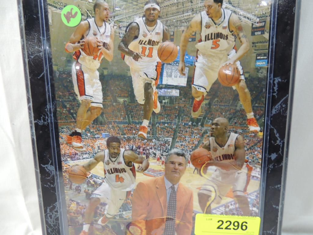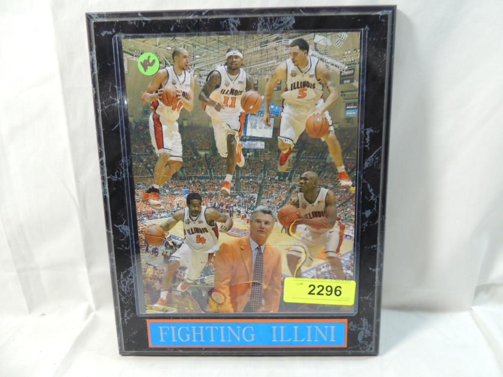 2005 FIGHTING ILLINI PLAQUE SHOWING 5 PLAYERS AND COACH. SLIGHT DAMAGE SEE PICTURE FOR DETAILS. AS SHOWN.