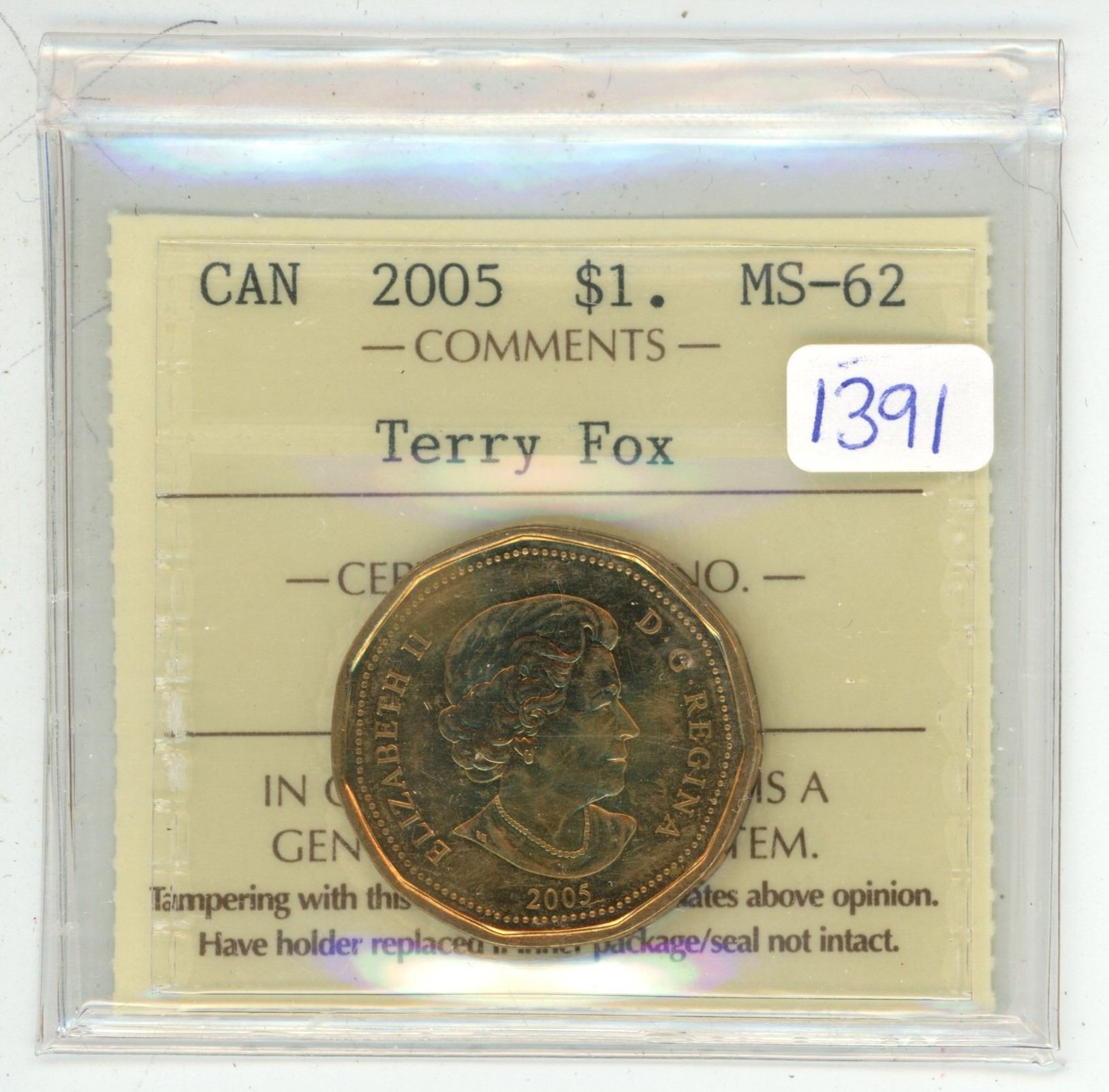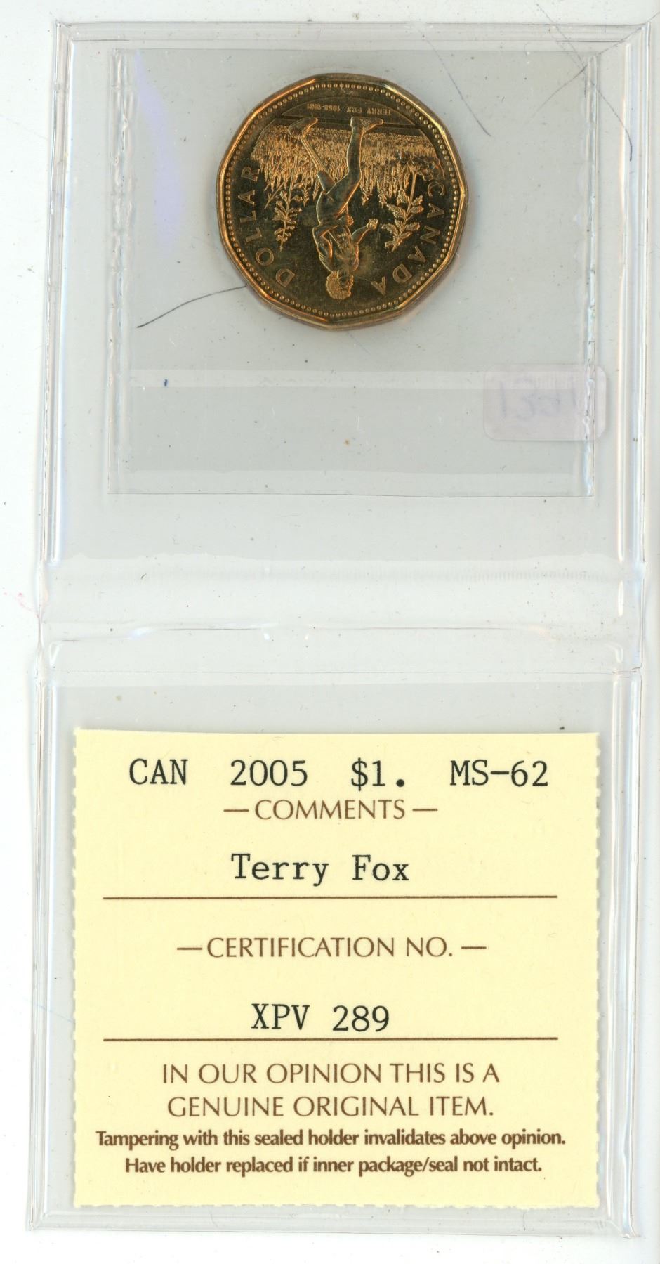 2005 ICCS graded, "Terry Fox" Canadian 1 dollar loonie coin - MS62