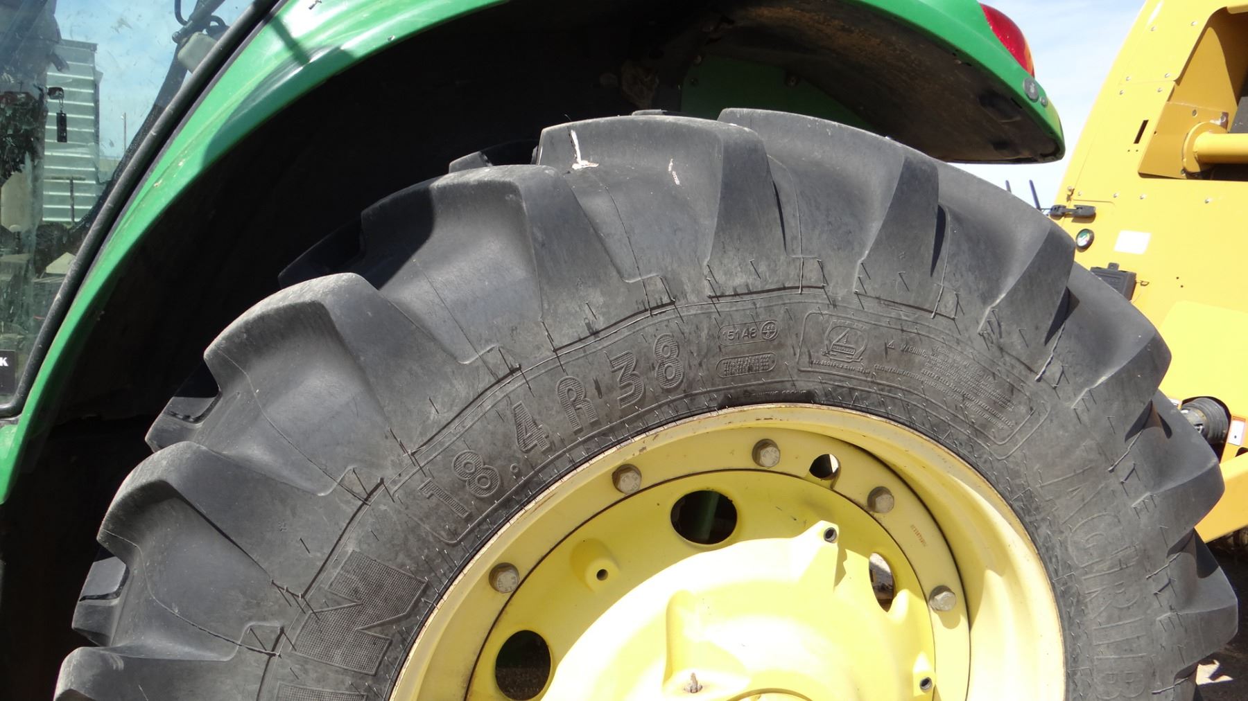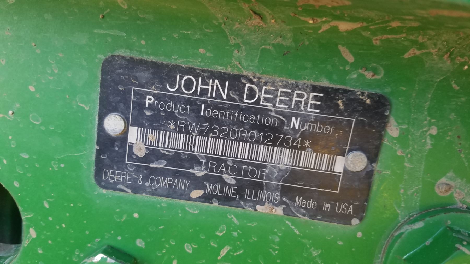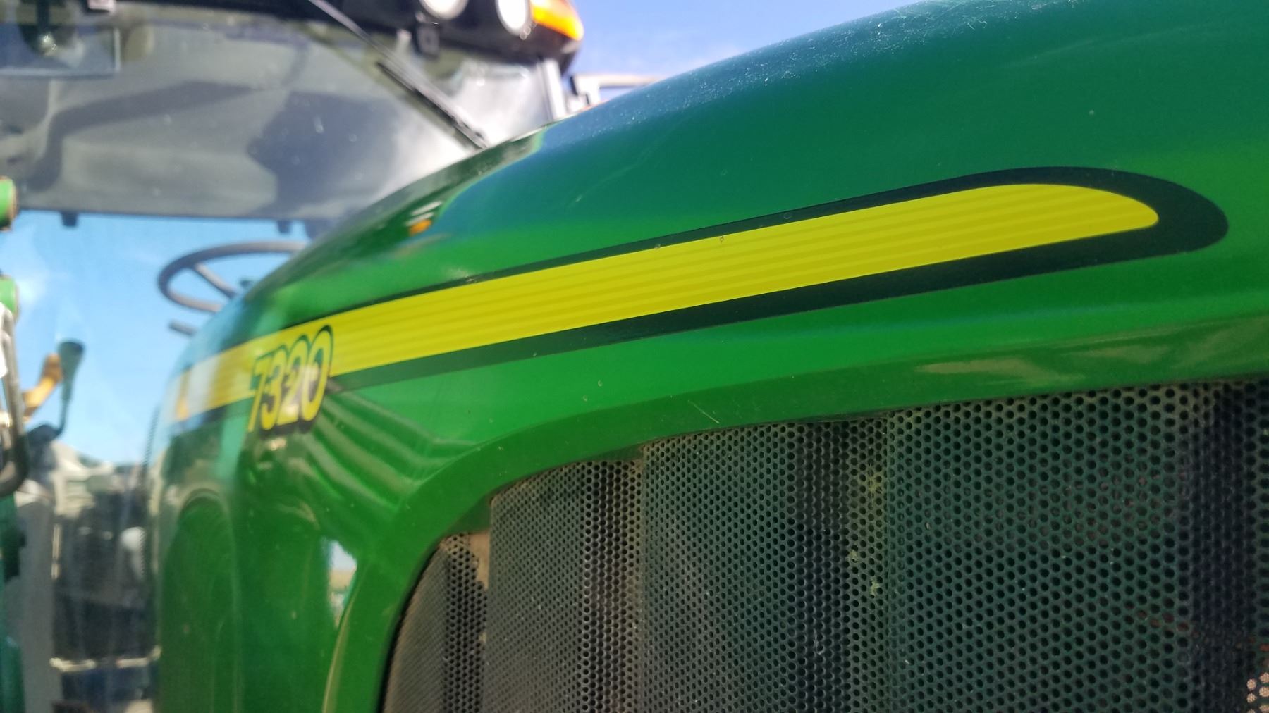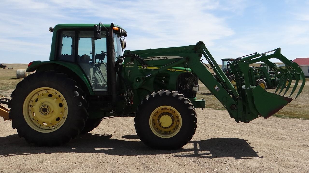 2005 JD 7320 w/ JD 741 loader, 7’ bucket/grapple, 5671 hrs., 6.8L diesel, no DEF, 125 eng hp/105 pto hp, PowrQuad – 16 f/r, 3 hyd., 3 pt., dual pto, rear 18.4R38 90%, front 420/85R26 75%. Serial # RW7320R012734