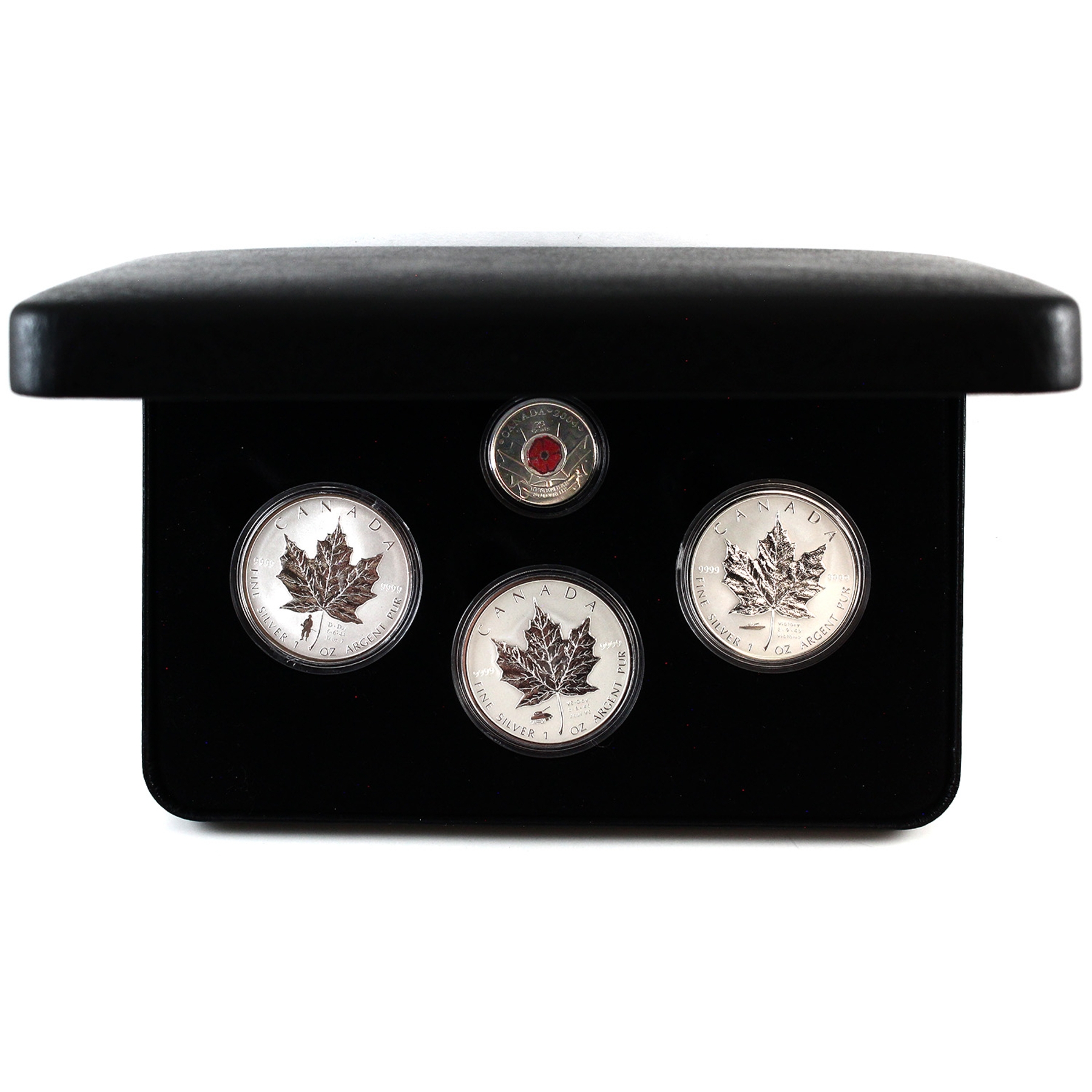 INCLUDES: .9999 Silver Maple Leaf coins with the following privy marks: D-Day, VE Day and VJ Day & an additional colourized Poppy quarter. Capsules may be lightly scuffed.