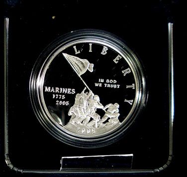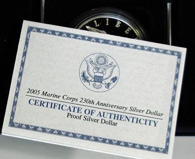 2005 MARINE CORPS ANNIVERSARY PROOF COMMEMORATIVE SILVER DOLLAR, ORIGINAL PACKA