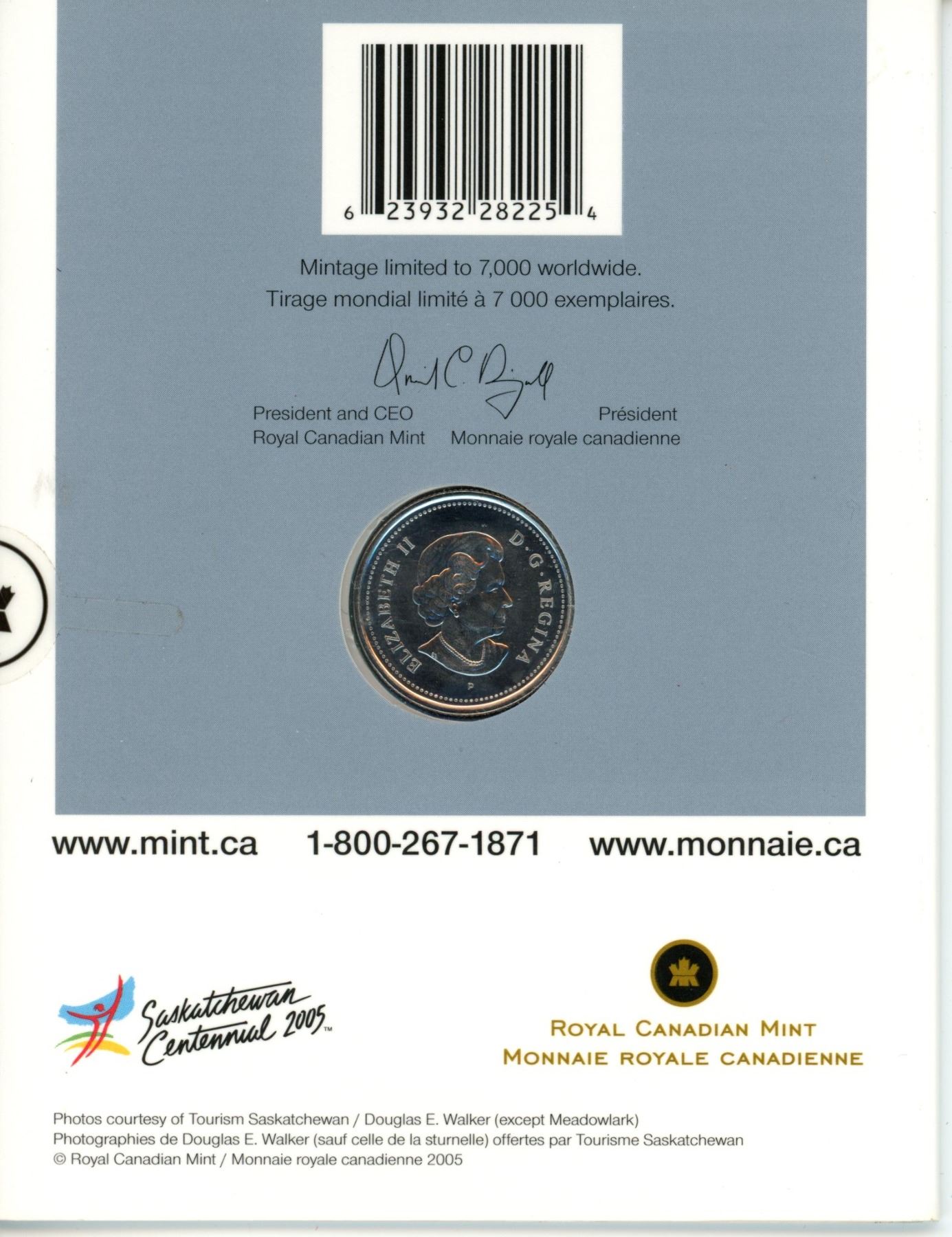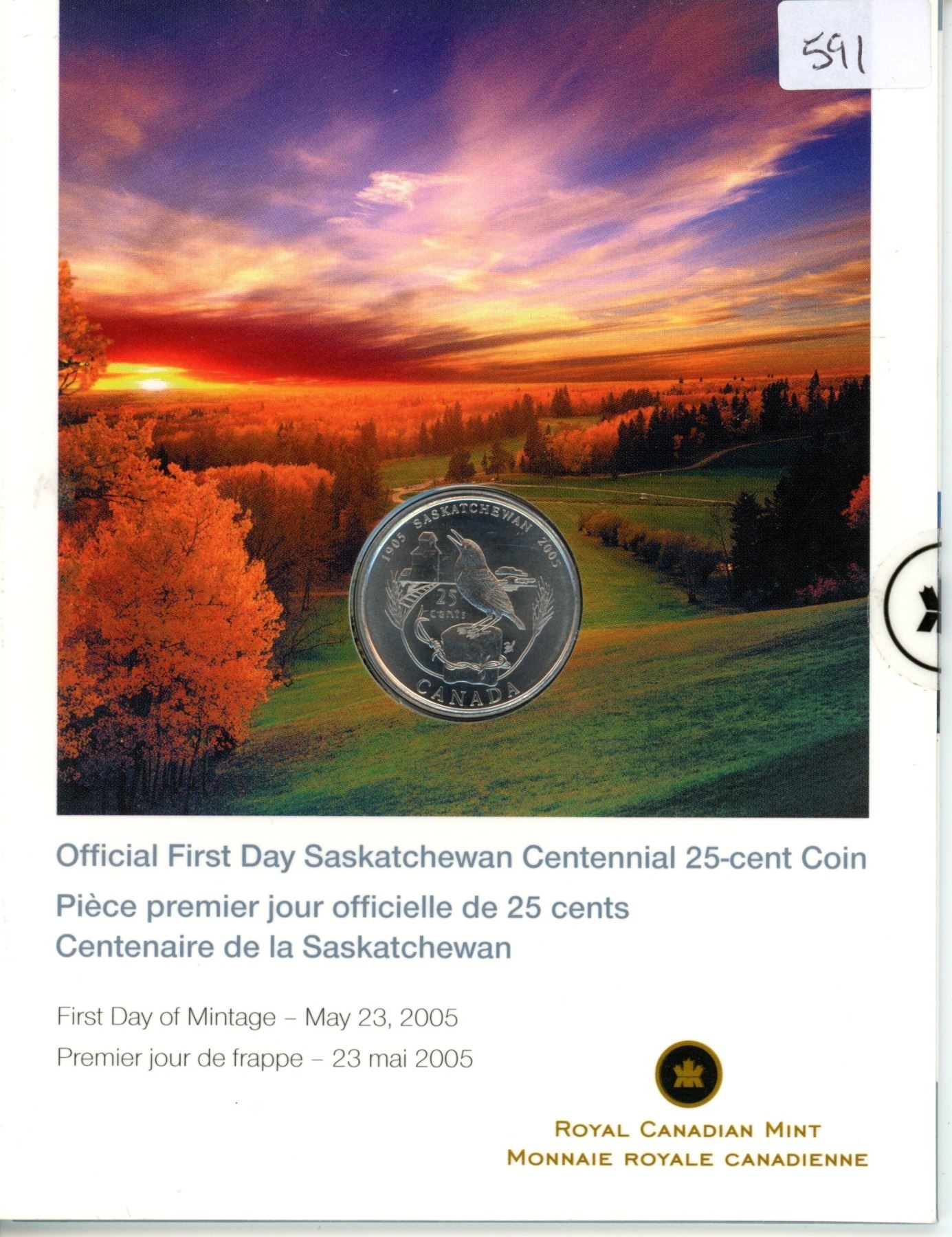 2005 Official First Day Saskatchewan Centennial 25 Cents Coin. In original RCM folder of issue. Mintage of 7,000.
