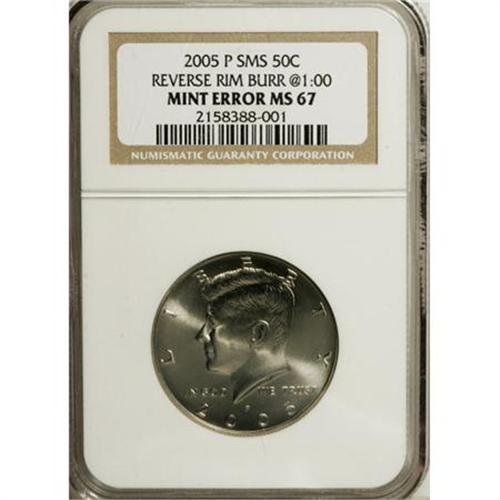 <B>2005-P 50C Kennedy Half--Reverse Rim Burr at 1 O'clock--MS67 Satin Finish NGC.</B></I> The rim burr appears as a small piece of missing metal with the underlying copper exposed.<BR><BR><b>Shipping:</b> Coins & Currency (<a target="_blank" href="http://www.heritageauctions.com/common/shipping.php">view shipping information</a>)