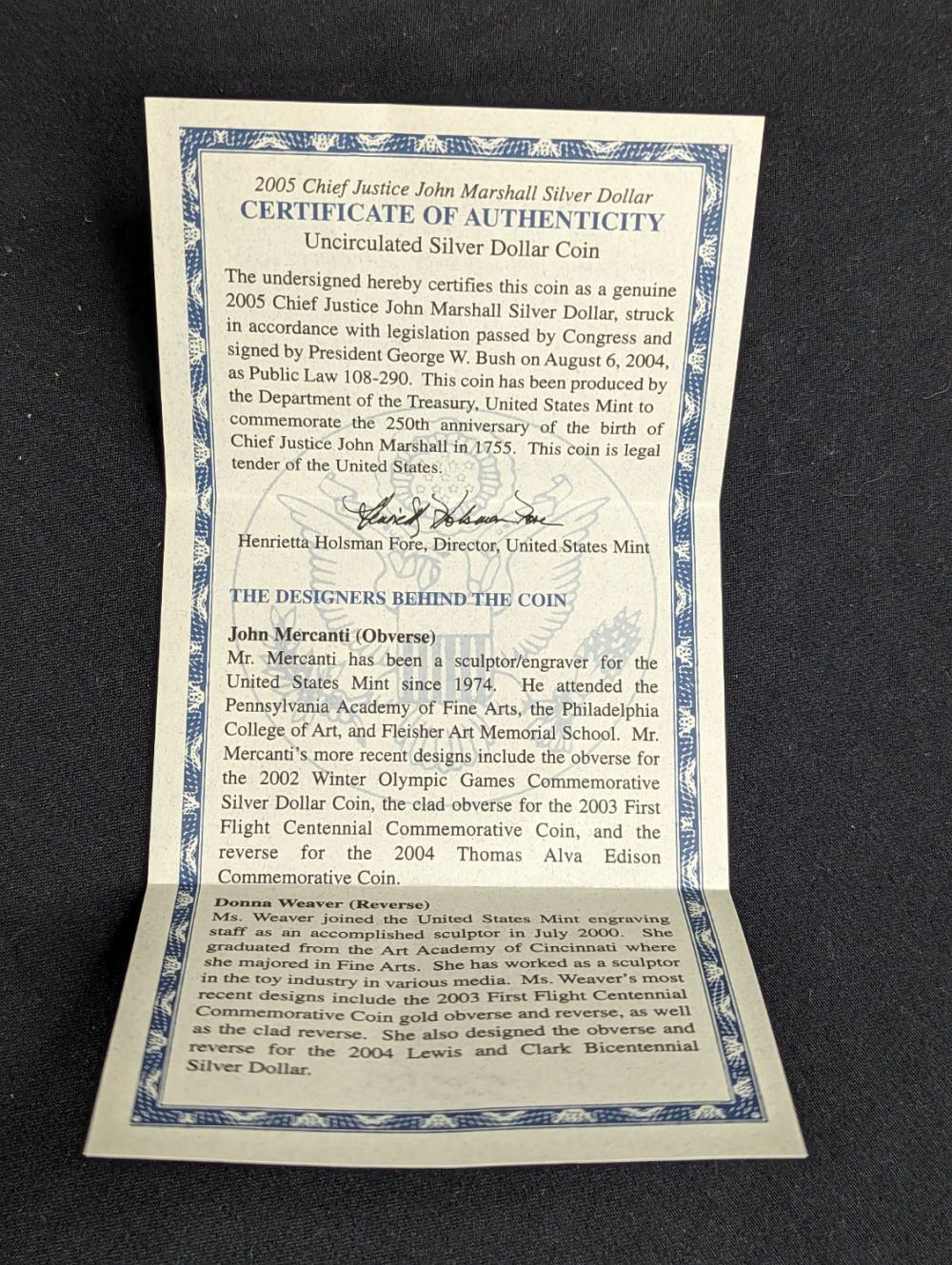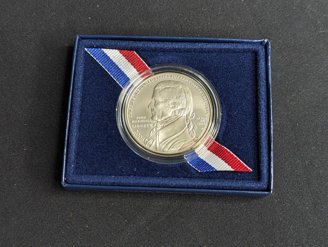A 2005 P Chief Justice John Marshall Commemorative Silver Dollar. A Beautiful Coin in original box with COA.