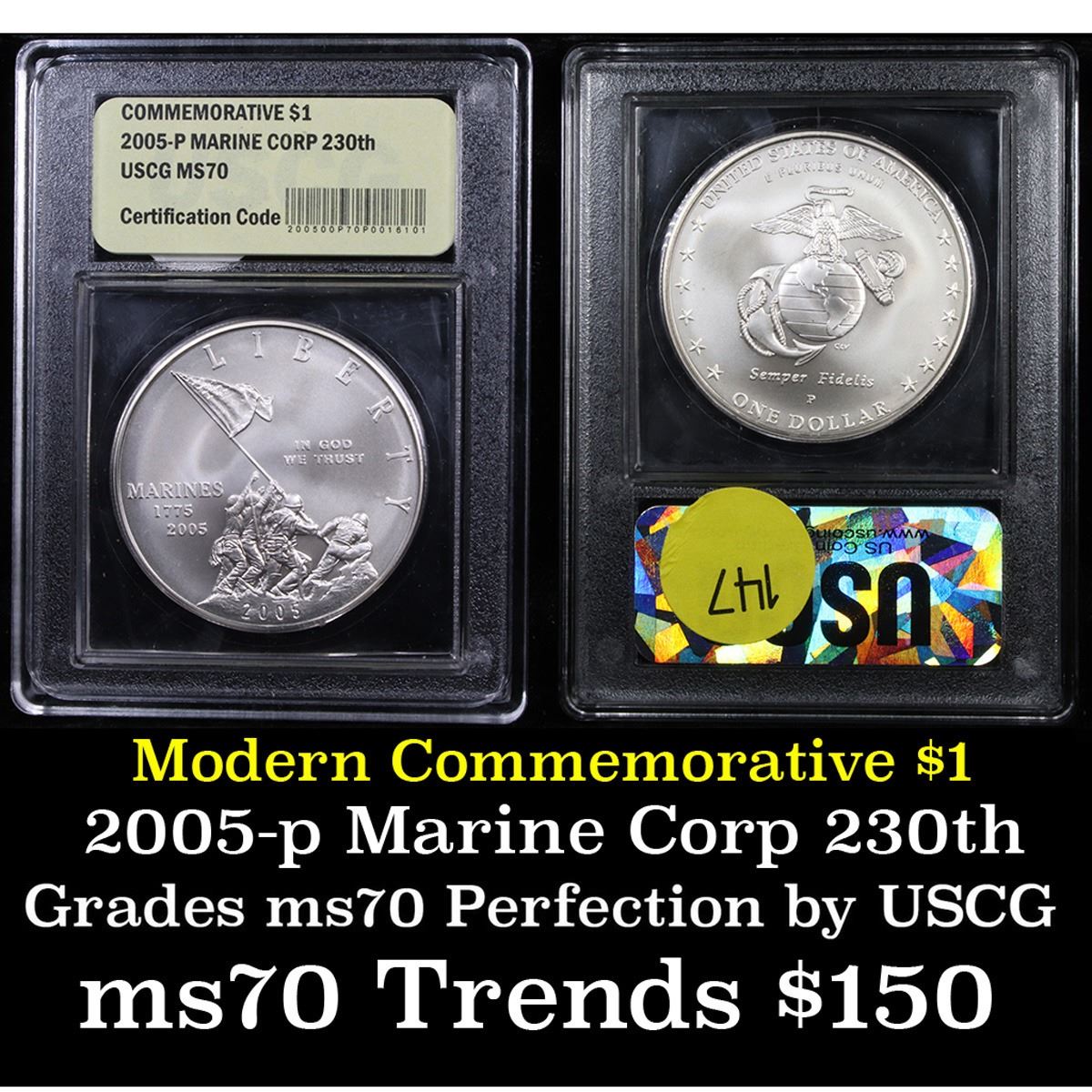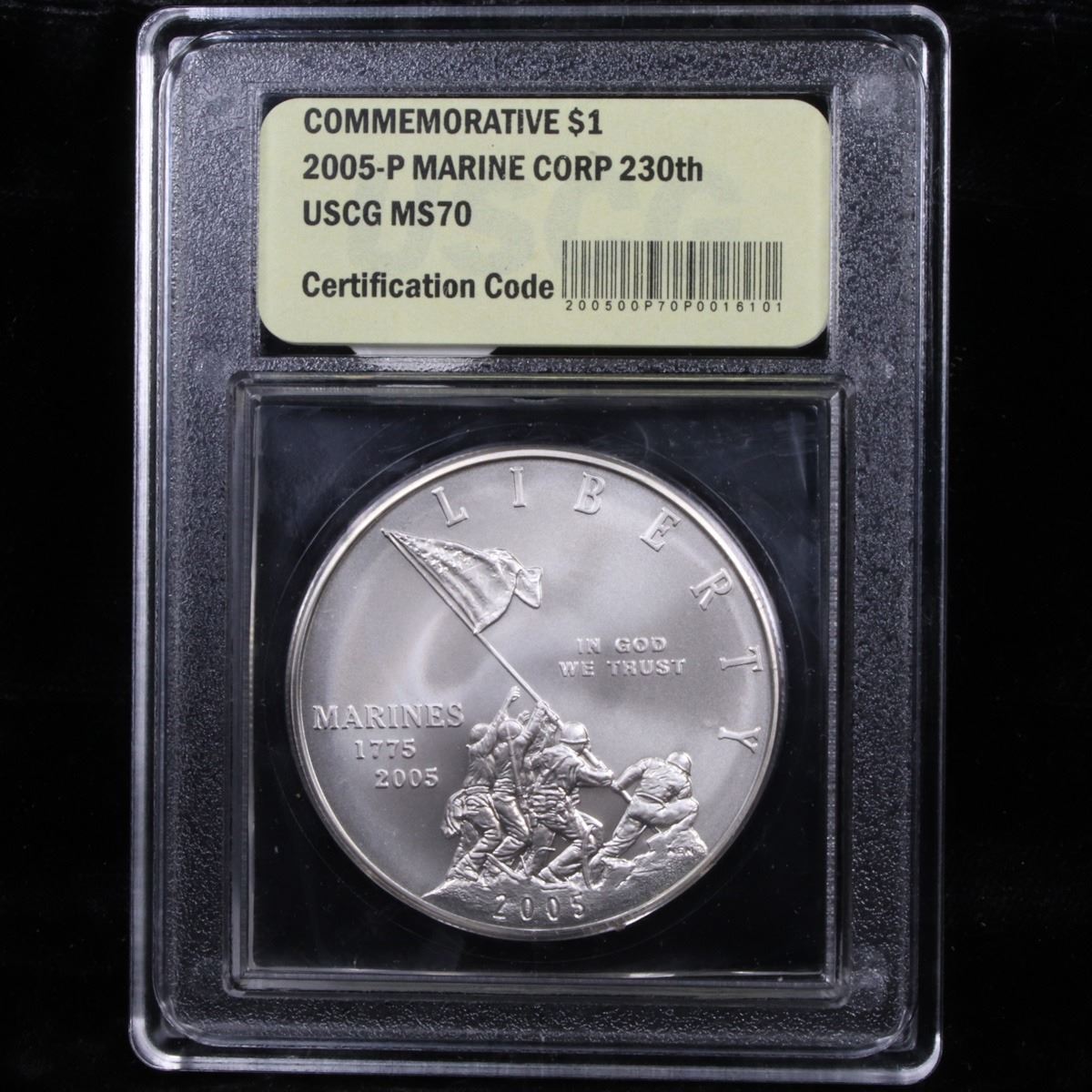 2005-P Marines Modern Commem Dollar $1 Graded GEM++ Proof Deep Cameo by USCG. The 2005 Marine Corps Silver Dollar was issued to mark the 230th anniversary of the Marines. The design features the iconic images of the Marine Corps. This Uncirculated Commemorative is Graded ms70 by USCG.