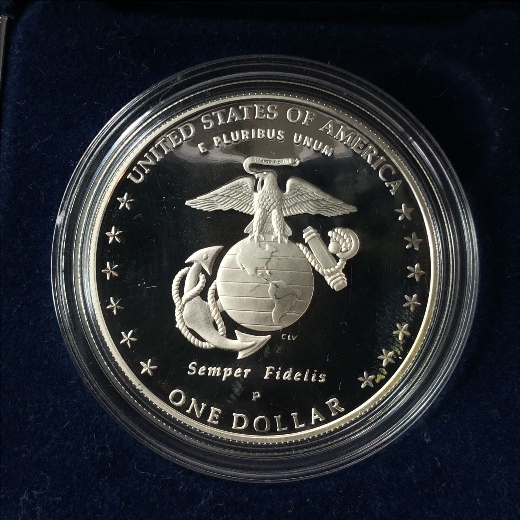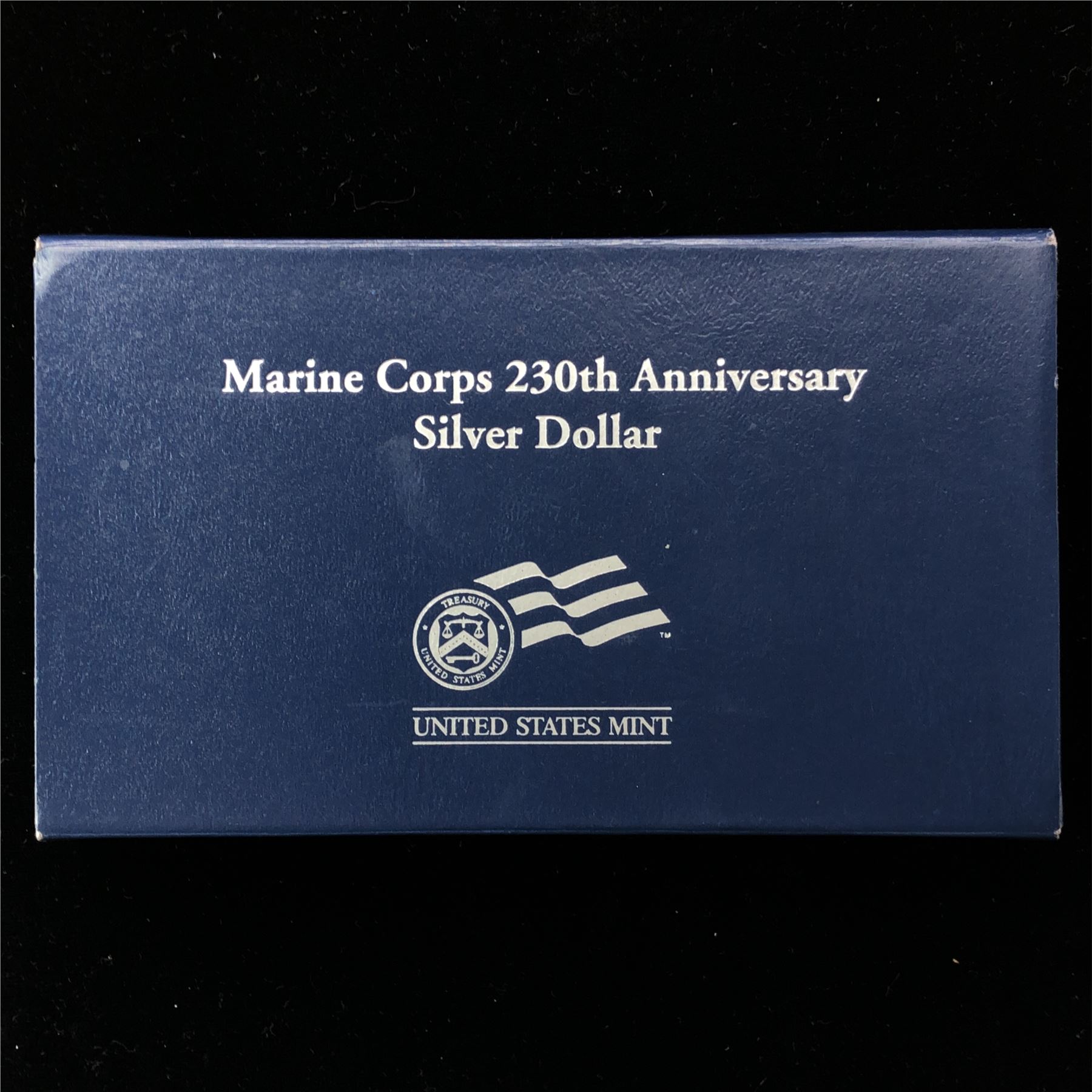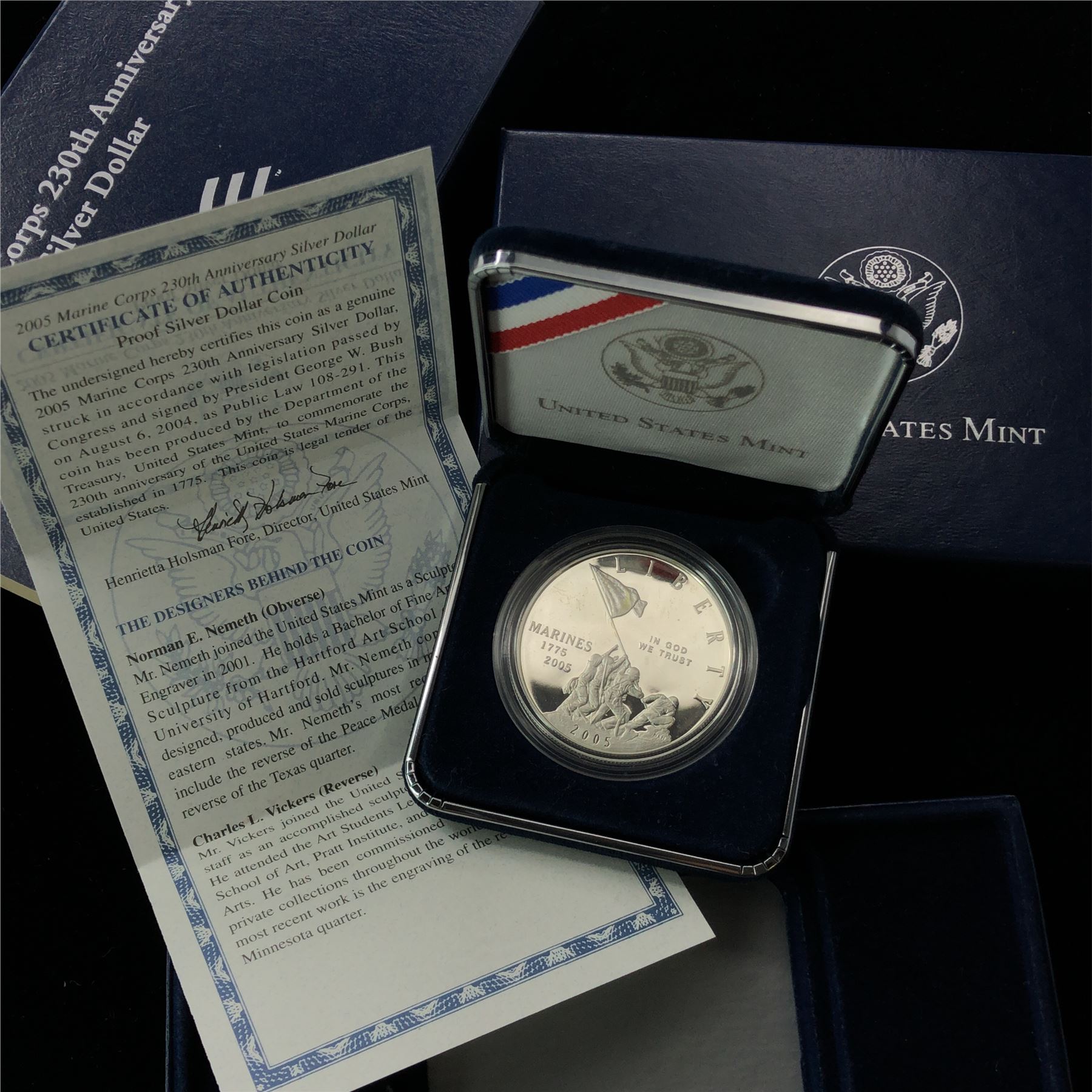 A 2005 P US Marine Corps Commemorative Silver Dollar in Original Issue Box with/COA. One of the most popular Commemorative Silver Dollars with the depiction of Iowa Jima on the obverse and with the Marine Corps Emblem on the reverse.