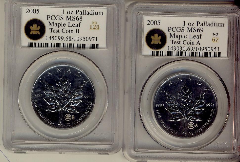2005 Palladium ML Test Coin A MS69 & 2005 Palladium ML Test Coin B MS68. Lot of 2 coins.
