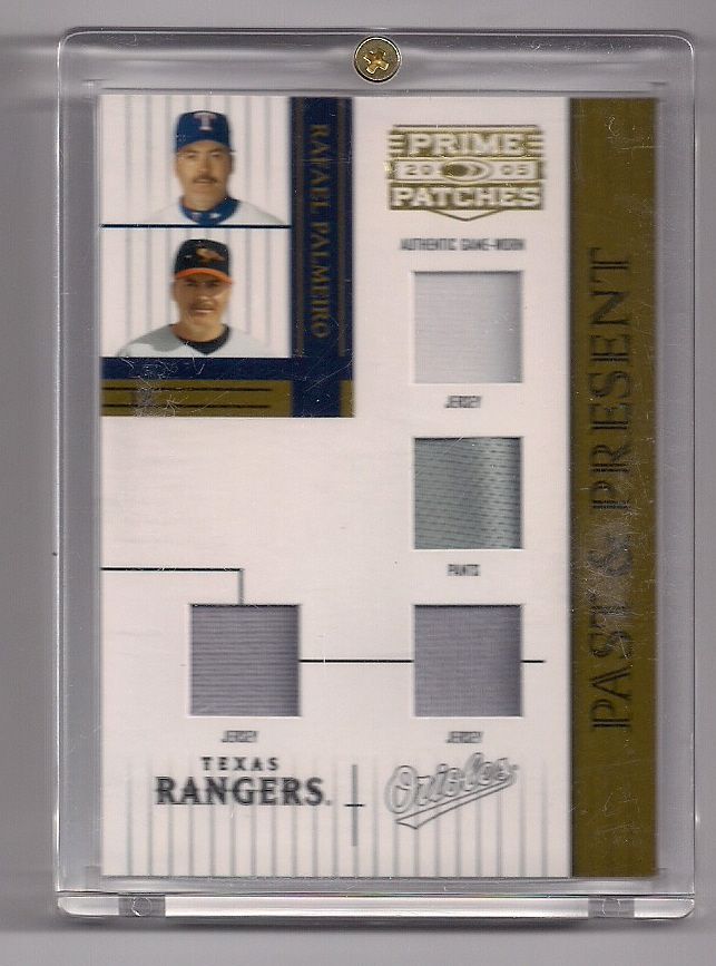 2005 Prime Patches Rafael Palmeiro Quad Game-Used Relic Insert Card. This Insert features (2) Solid Gray pieces of Jersey, a Solid White piece of Jersey, and a Solid Gray piece of Game-Worn Pants. This Insert is serial numbered 069/150! Card is Near Mint.