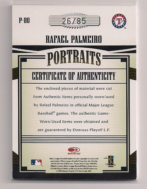 2005 Prime Patches Rafael Palmeiro Triple Game-Used Relic Insert Card. This Insert features an Off-White piece of Game-Used Hat, a Solid White piece of Game-Used Pants, a Solid Gray piece of Game-Used Jersey, and is serial numbered 26/85! This Insert is Near Mint.