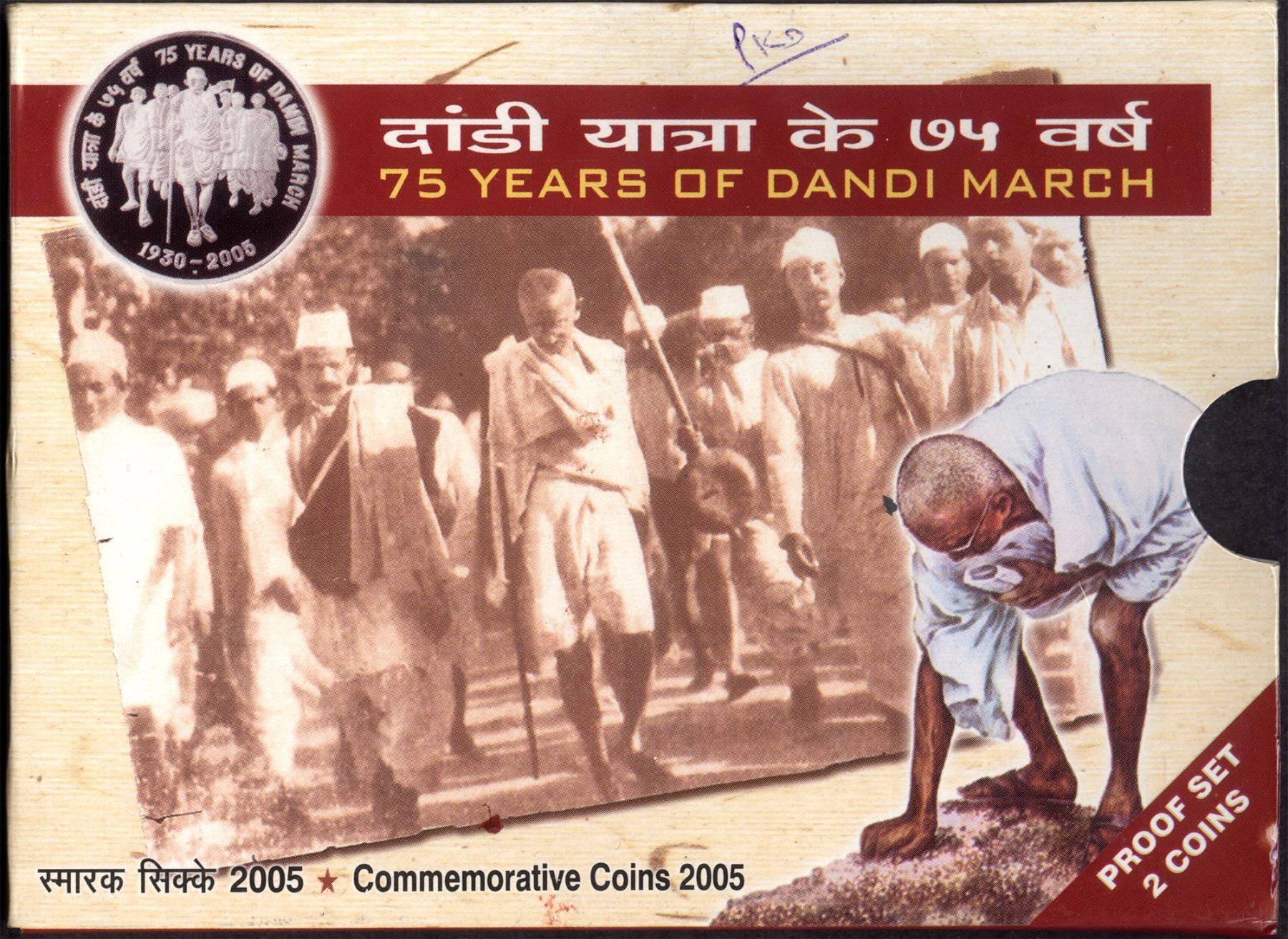 Republic India, 2005, Proof Set, 75 Years of Dandi March, Set of 2 Coins, Silver 100 Rupees & Copper Nickel 5 Rupees, Bombay Mint,(RB # 287), intact in the blister pack, preserved in the original packing, Proof.