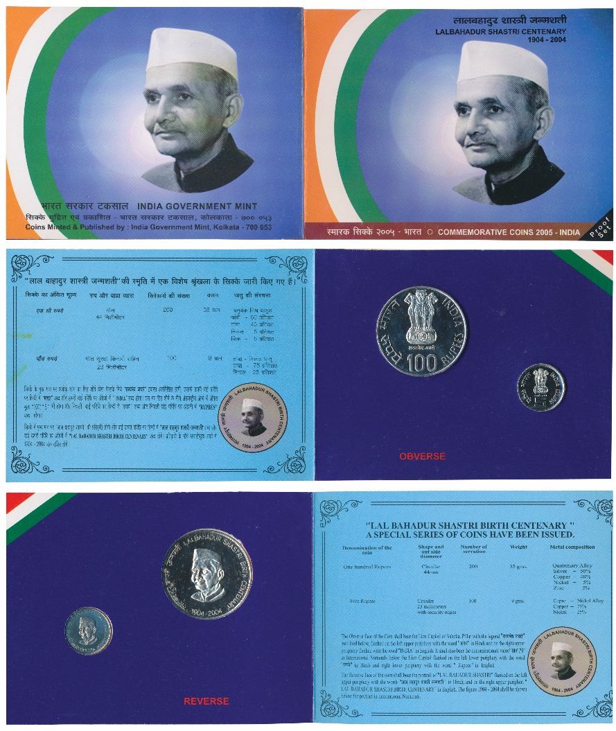 2005 Proof Set, Lalbahadur Shastri Centenary, set of 2, Rupees 5 and 100. In immaculate condition, within original packaging, Very Rare. (2)