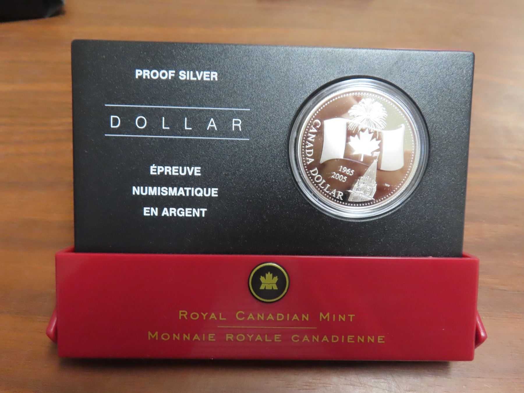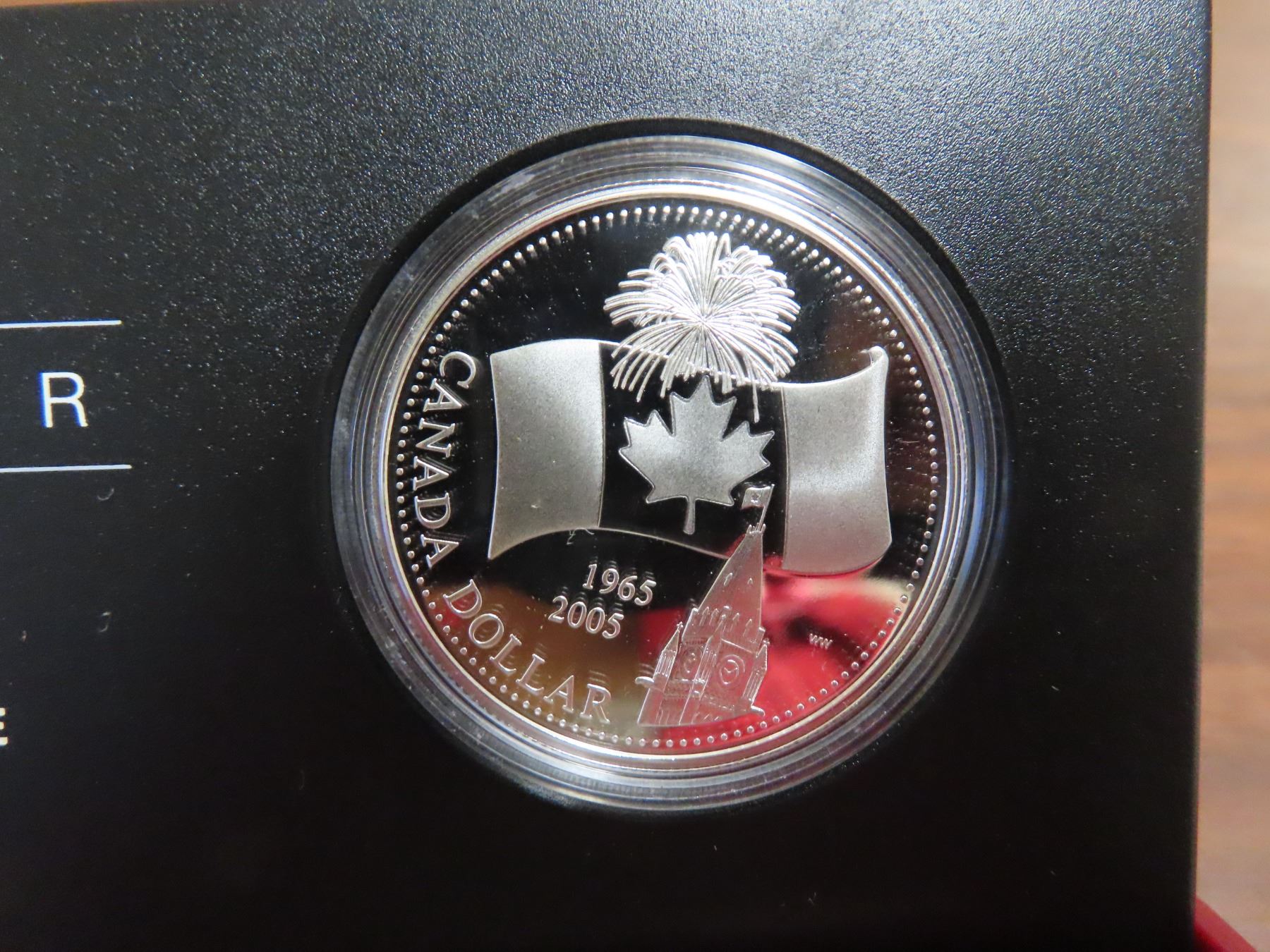 2005 Proof Silver Dollar. Commemorates the 50th Anniversary of the Canadian flag. Proof with Ultra Heavy Cameo. 99.99% pure Silver. Housed in its original Royal Canadian Mint case of issue.