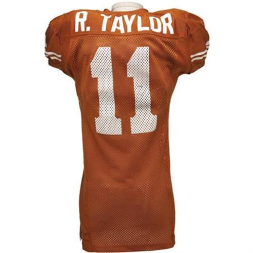 <B>2005 Ramonce Taylor Game Worn Jersey.</B></I> Burnt orange gamer was worn by the Texas Longhorns star running back during the glorious NCAA Championship season, a fact assured by the number "11" screened on front, back and shoulders, as 2005 was the only year Taylor would sport the digits. "Texas" and "R. Taylor" balance the design on front and back. Big Twelve and Nike patches adorn the upper right and left chest respectively. Taylor's twelve rushing and three receiving touchdowns this season made him a key factor in the drive to destiny that culminated in the thrilling upset over the heavily favored USC Trojans in the 2006 Rose Bowl. The shoulder and sleeve areas show dings and minor turf paint remnants, speaking to the moderate but entirely acceptable wear. A special keepsake of a season no UT fan will soon forget. <I>LOA from Lou Lampson.</B></I><BR><BR><b>Shipping:</b> Clothing, Costumes & Jerseys (<a target="_blank" href="http://www.heritageauctions.com/common/shipping.php">view shipping information</a>)