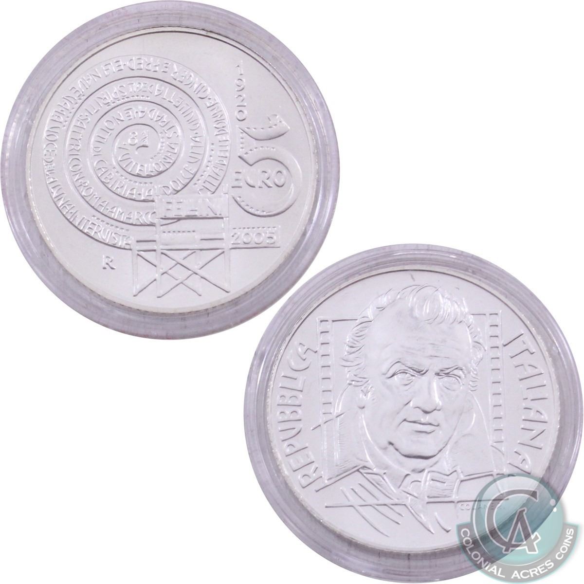 2005 Republic of Italy 5 Euro 85th Birthday of Federico Fellini Silver Coin (KM #255). This coin Weighs 18 grams and contains 0.5353 oz of pure Silver.