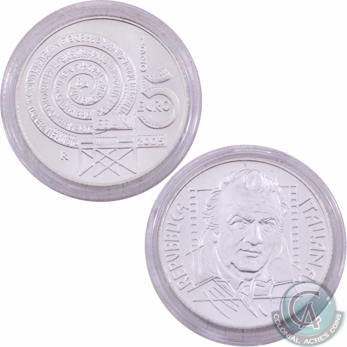 2005 Republic of Italy 5 Euro 85th Birthday of Federico Fellini silver coin.( KM #255). This coin Weighs 18 grams and contains 0.5353 oz of pure silver.