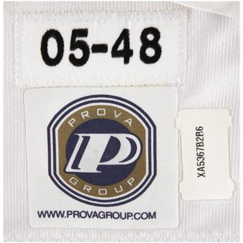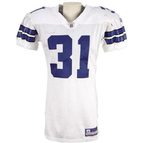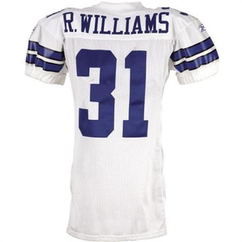 <B>2005 Roy Williams Game Worn Jersey.</B></I> Considered one of the finest safeties in the National Football League, this number eight overall pick in the 2002 draft was able to prowl closer to the line of scrimmage in 2005 due to Anthony Henry's stabilization of the right cornerback position, allowing Williams to record two and a half sacks to go along with his three interceptions. This white mesh gamer from Williams' third Pro Bowl season exhibits great overall wear, with contact scrapes on the white dazzle cloth shoulders and dirt marks throughout. Number "31" is applied in royal blue tackle twill to chest, back and shoulders, with "R. Williams" spanning the rear nameplate in bold block lettering. "Reebok [size] 48" tagging is found at front left tail, with "05-48" year/size swatch joining Prova Group's authenticating serialized stickering below. Incidentally, Williams has announced he will switch to his old college number "38" for the 2008 season, making the offered jersey all the more appealing. <I>LOA from Lou Lampson.</B></I><BR><BR><b>Shipping:</b> Clothing, Costumes & Jerseys (<a target="_blank" href="http://www.heritageauctions.com/common/shipping.php">view shipping information</a>)