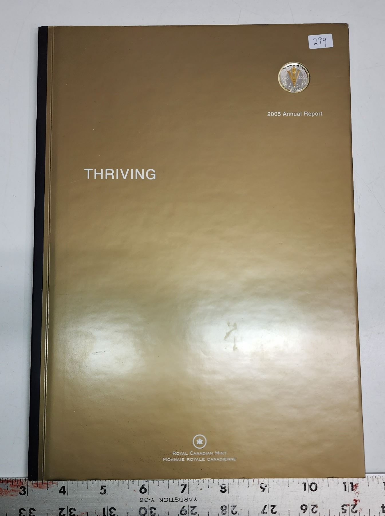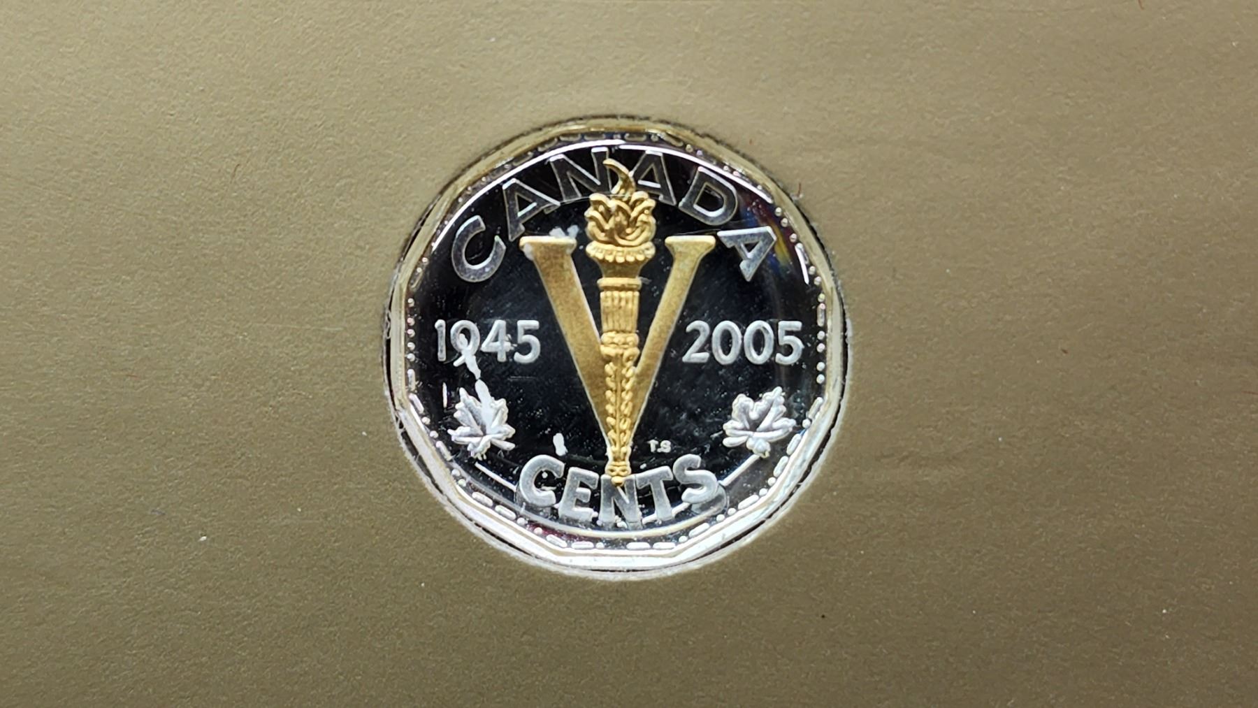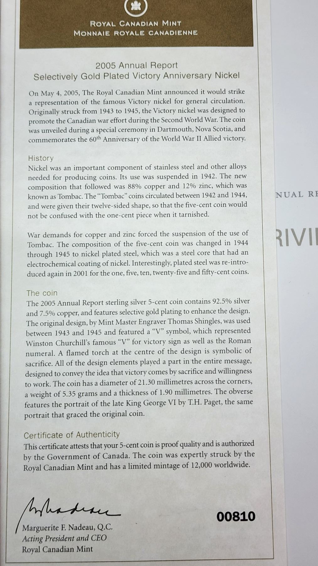 2005 Royal Canadian Mint Annual Report. Includes Proof 24-karat Gold Plated Sterling Silver 5 Cents. Obverse depicts King George VI, while the reverse depicts the V For Victory design used from 1943 to 1945. This coin is only available in this Annual Report. Scarce.