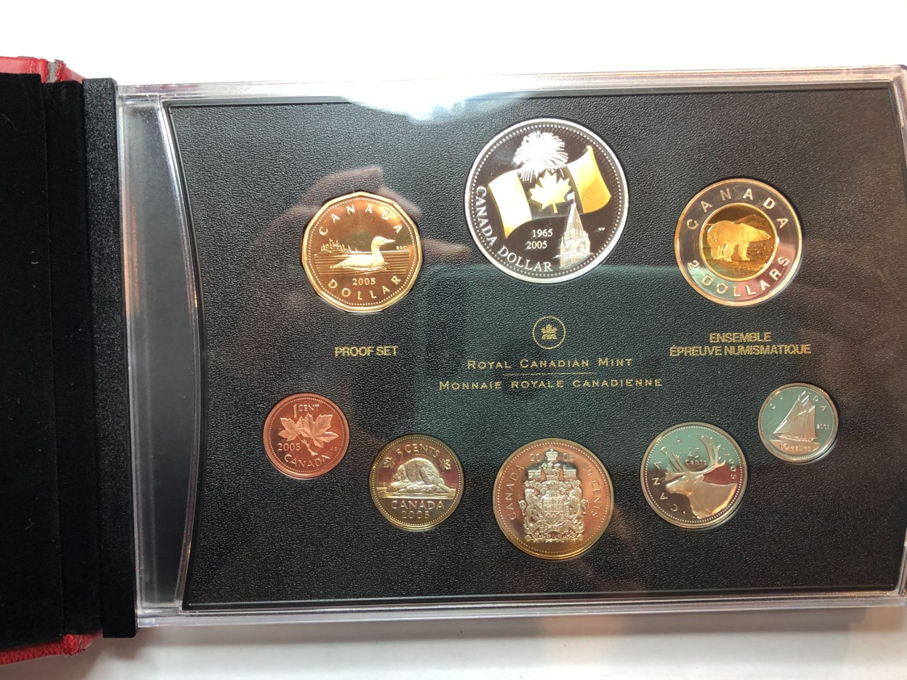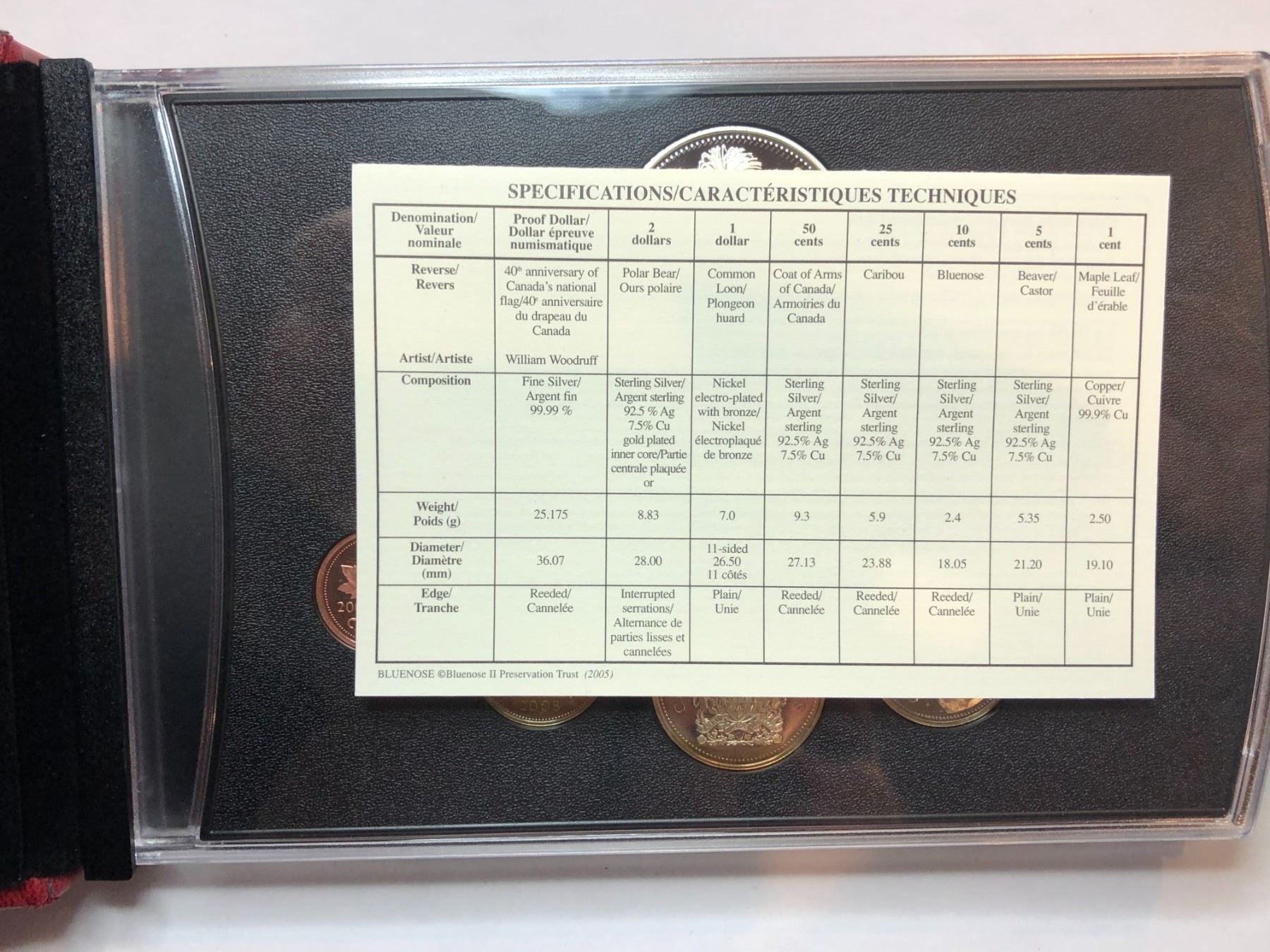 2005 Royal Canadian Mint Proof Set The 40th anniversary of Canada's national flag dollar is 99.99% fine silver and weighs 25.175 grams The Polar Bear 2 dollars is 92.5% sterling silver and weighs 8.83 grams 50 cent - 92.5% sterling silver, weighs 9.3 grams 25 cent - 92.5% sterling silver, weighs 5.9 grams 10 cent - 92.5% sterling silver, weighs 2.4 grams 5 cent - 92.5% sterling silver, weighs 5.35 grams