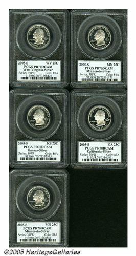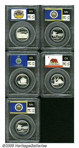 <B>2005-S<25C> California Silver PR70 Deep Cameo PCGS,</B></I> fully struck and seemingly unimprovable with impeccably preserved surfaces and great contrast on each side; <B>2005-S Minnesota Silver PR70 Deep Cameo PCGS,</B></I> (2) both coins are sharply struck and display glassy, highly reflective fields and snow-white frosted devices; <B>2005-S Kansas Silver PR70 Deep Cameo PCGS,</B></I> a beautiful black and white proof specimen that seems perfect in every way; and a <B>2005-S West Virginia Silver PR70 Deep Cameo PCGS,</B></I> snow-white devices seem to float above watery, jet-black fields, a flawlessly executed and expertly preserved proof.<BR><I>From The Western Hills Collection.</B></I>