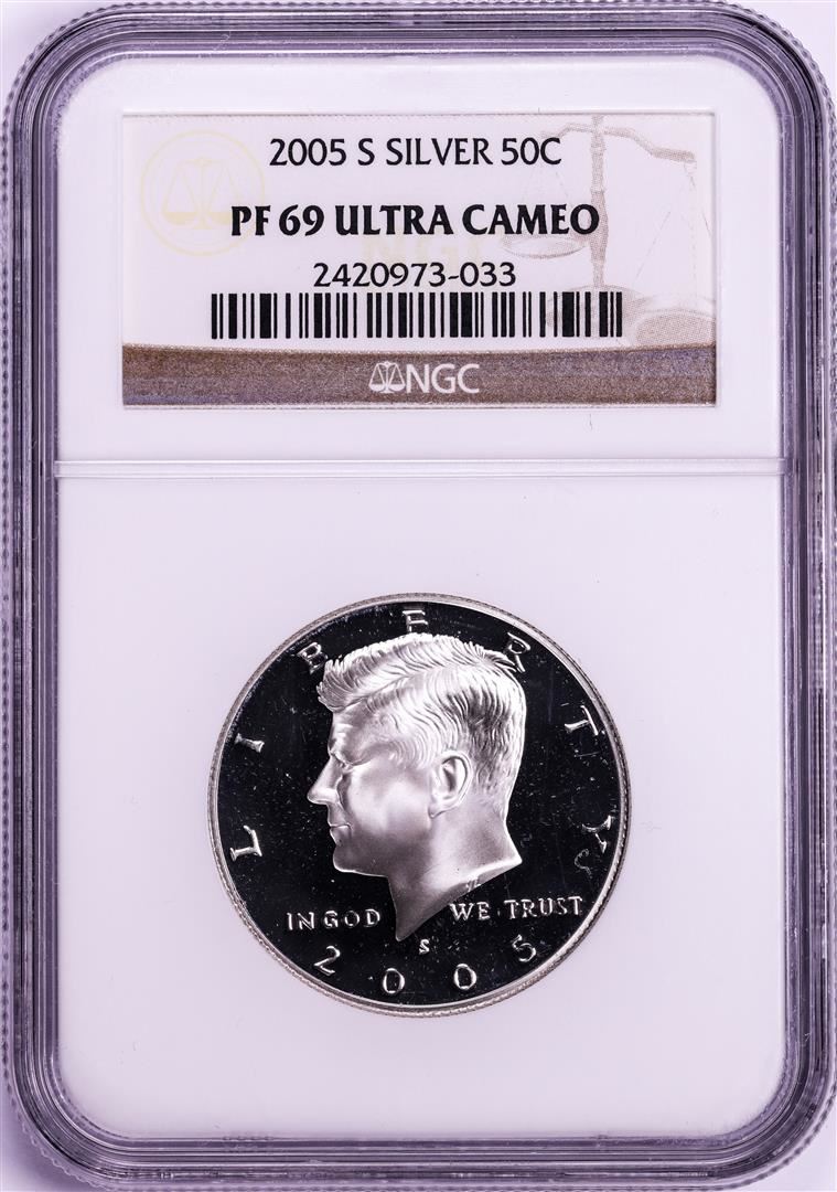 One 2005-S Silver Proof Kennedy Half Dollar Coin NGC PF69 Ultra Cameo.
