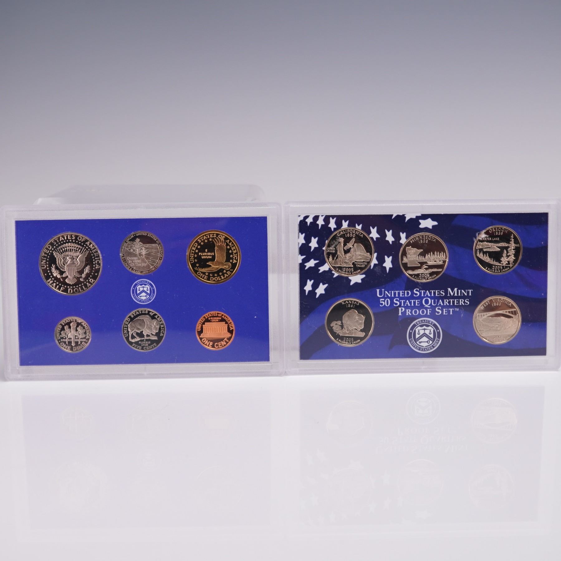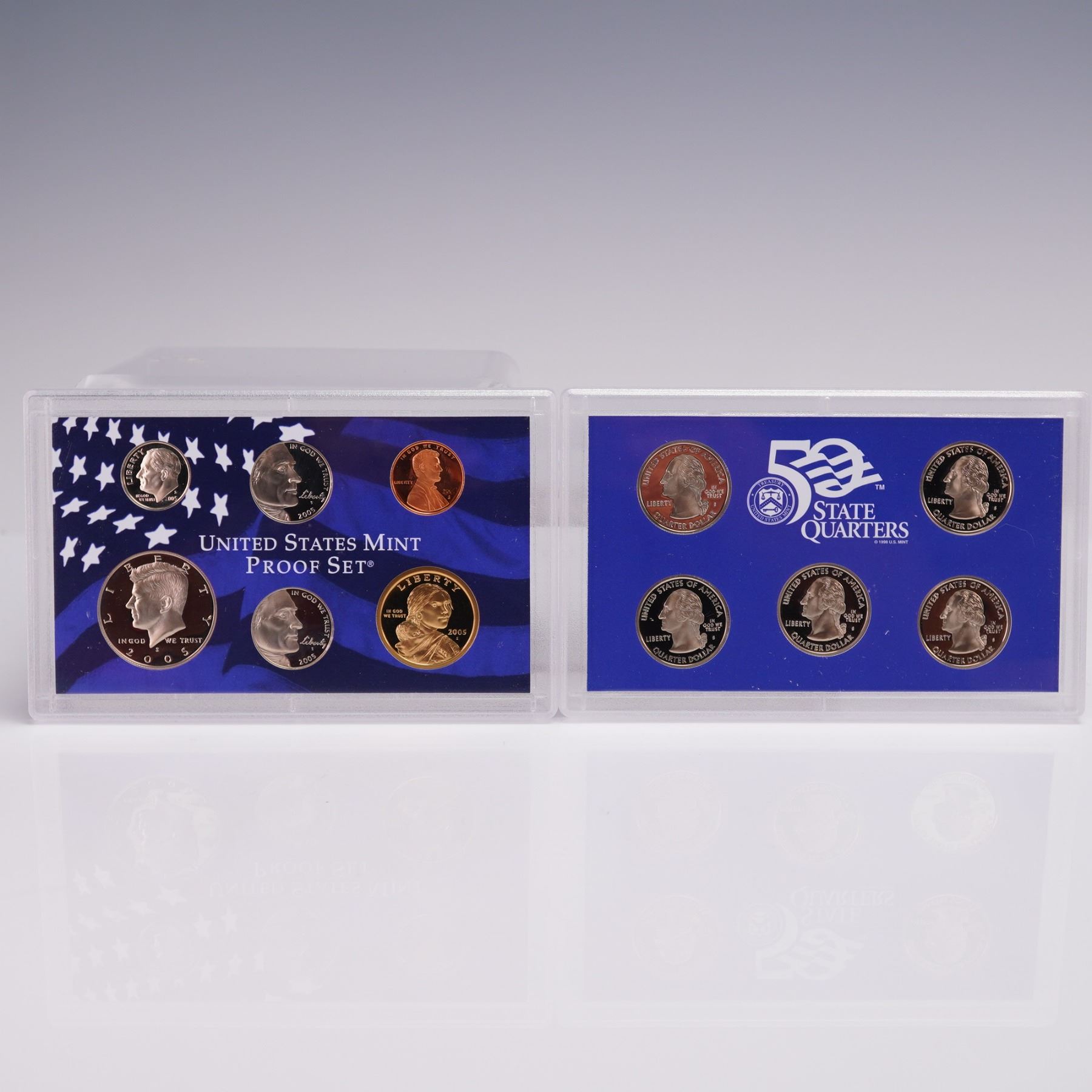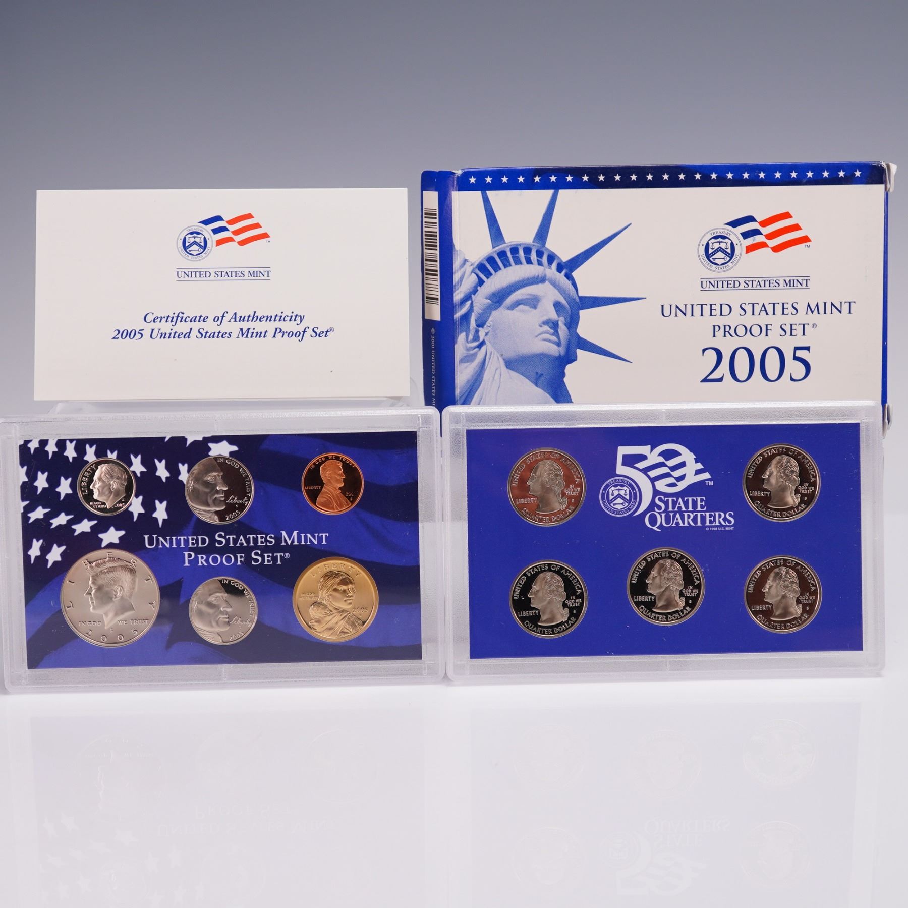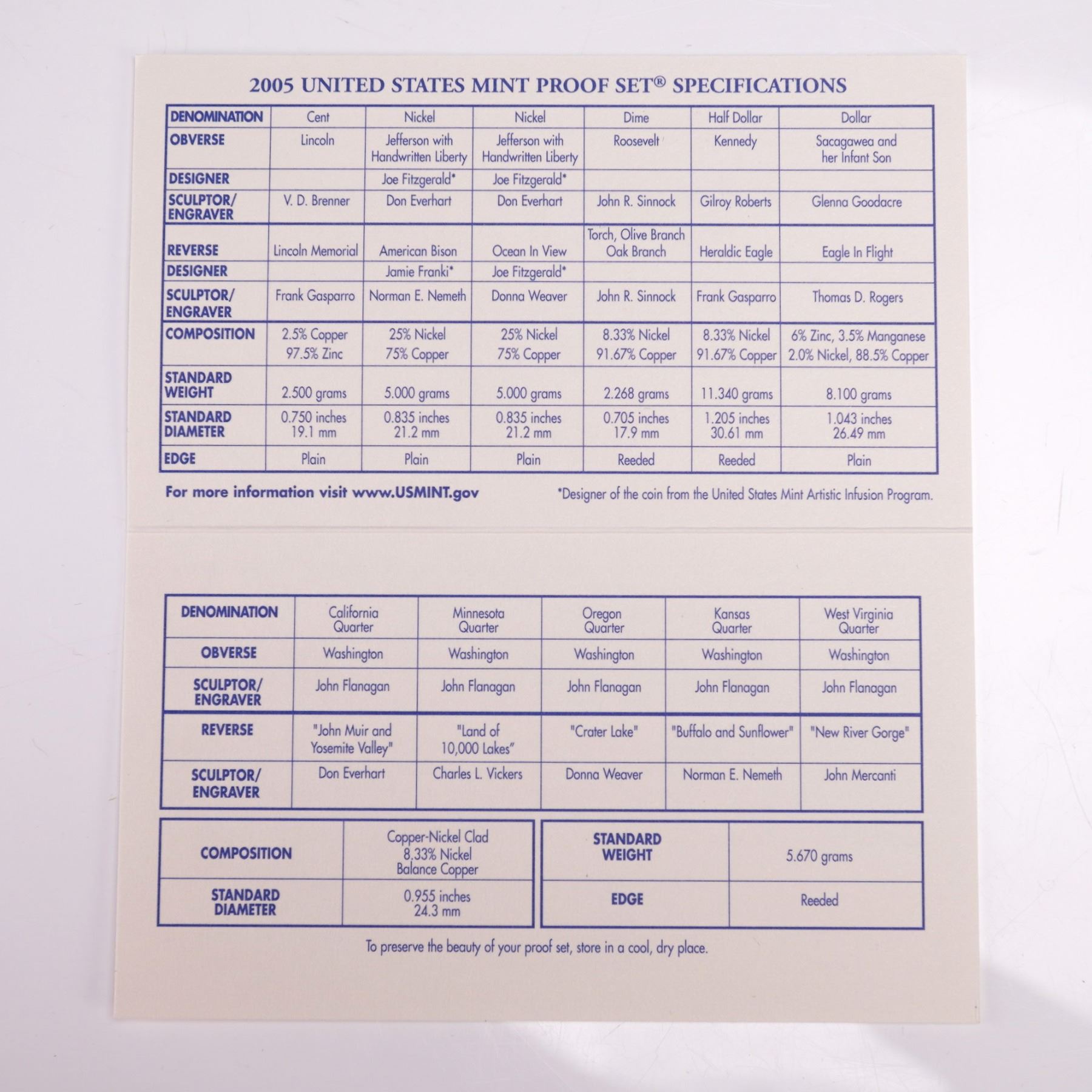 This 2005-S United States Mint Proof Set includes a total of eleven coins struck at the San Francisco Mint, each bearing a proof finish. The set contains the following denominations: one Lincoln cent, one Jefferson nickel (American Bison reverse), one Jefferson nickel ("Ocean in view! O! The joy!" reverse), one Roosevelt dime, one Kennedy half dollar, and one Sacagawea dollar. In addition, the set includes five copper-nickel clad state quarters from the 50 State Quarters Program, representing California, Minnesota, Oregon, Kansas, and West Virginia. All coins are presented in their original U.S. Mint packaging with accompanying Certificate of Authenticity. Each coin is intended to exhibit a cameo or deep cameo finish. United States Mint box: 5.5"L x 3.5"W x 0.75"H.