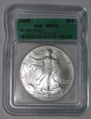 2005 SILVER EAGLE 1oz *CERTIFIED BY ICG MS-69*!! SILVER EAGLE CAME OUT OF SAFE BOX!! ***Coin, Currency & All Items Listed in this auction - Grades, Conditions and Values are not Safe Deposit Coins LLC Responsibilty. Grades, Condition and Values are determined by Consigner(s) & Buyers ONLY