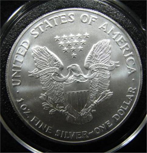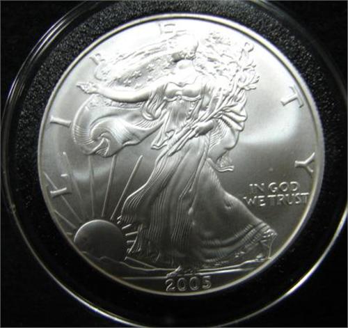2005 AMERICAN EAGLE SILVER DOLLAR. Coin is in circular case.