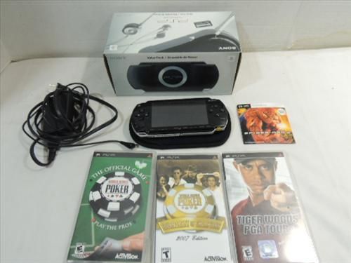 2005 SONY PSP 1001K, 4 GAMES. WORKS. IN ORIGINAL BOX. SPIDER-MAN 2, WORLD SERIES POKER, TIGER WOOD PGA. AS SHOWN. VIEW PICTURE FOR DETAIL.