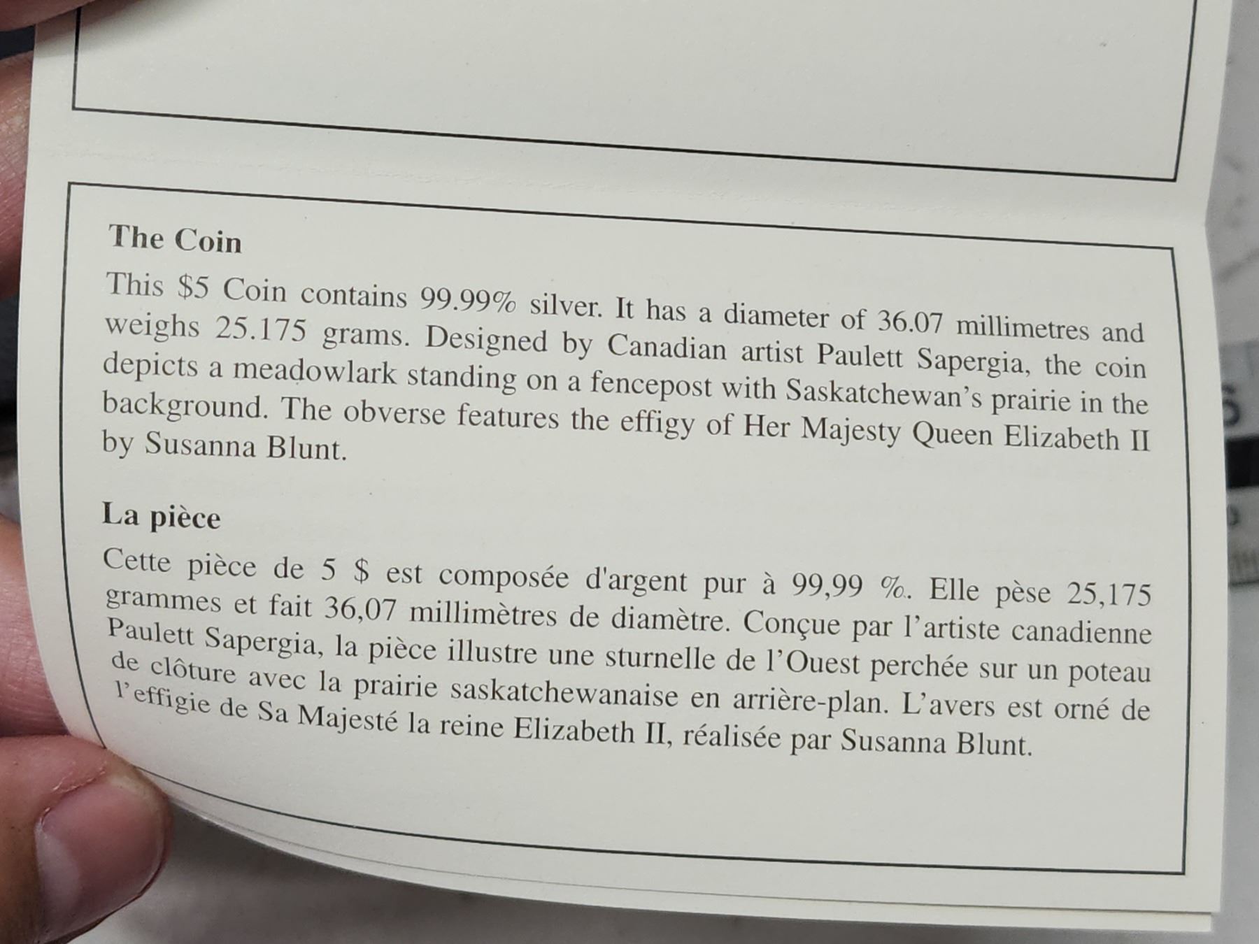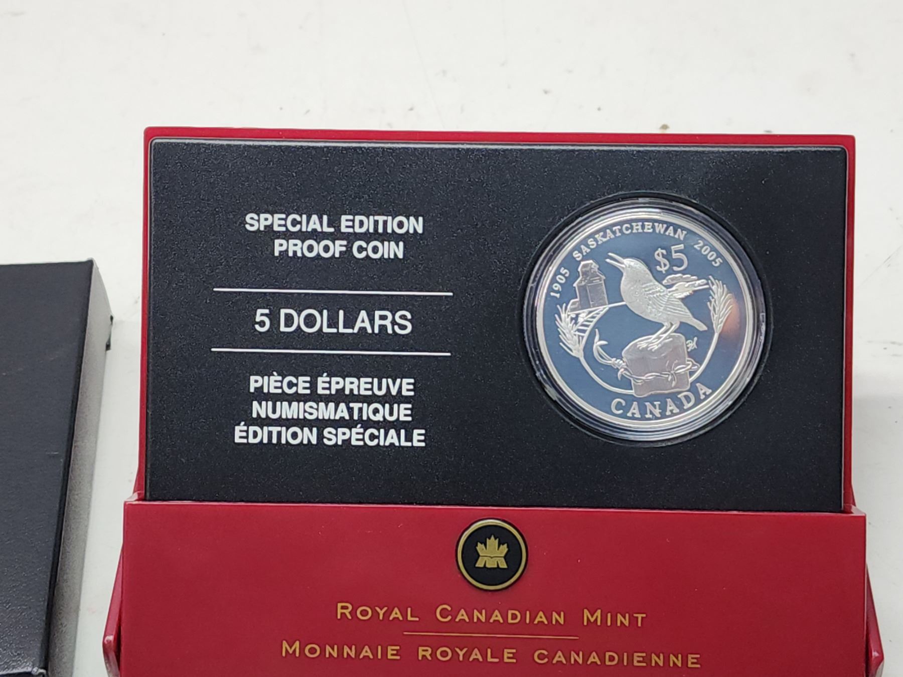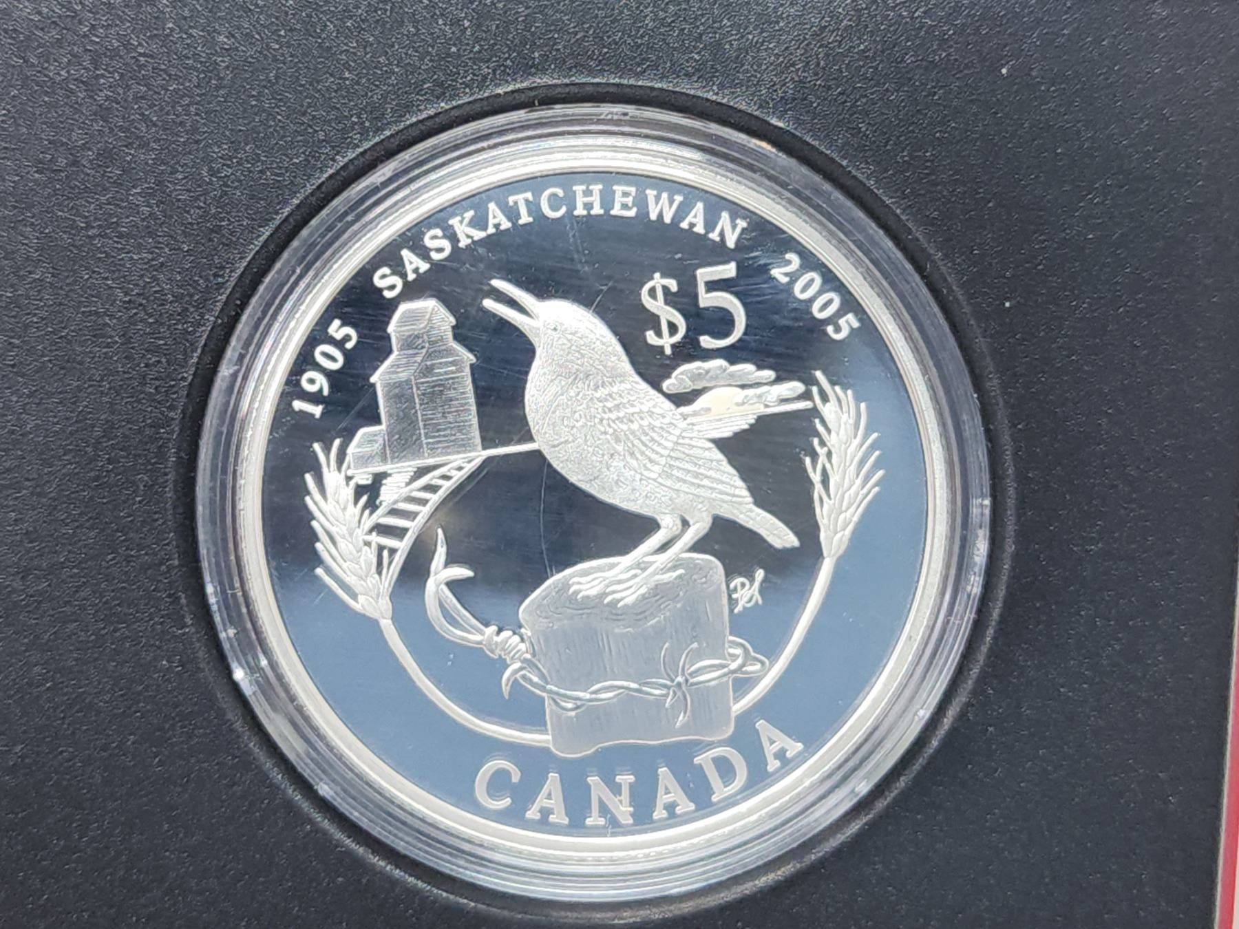 2005 Saskatchewan Centennial, Canadian fine silver 5 dollar proof coin - in case