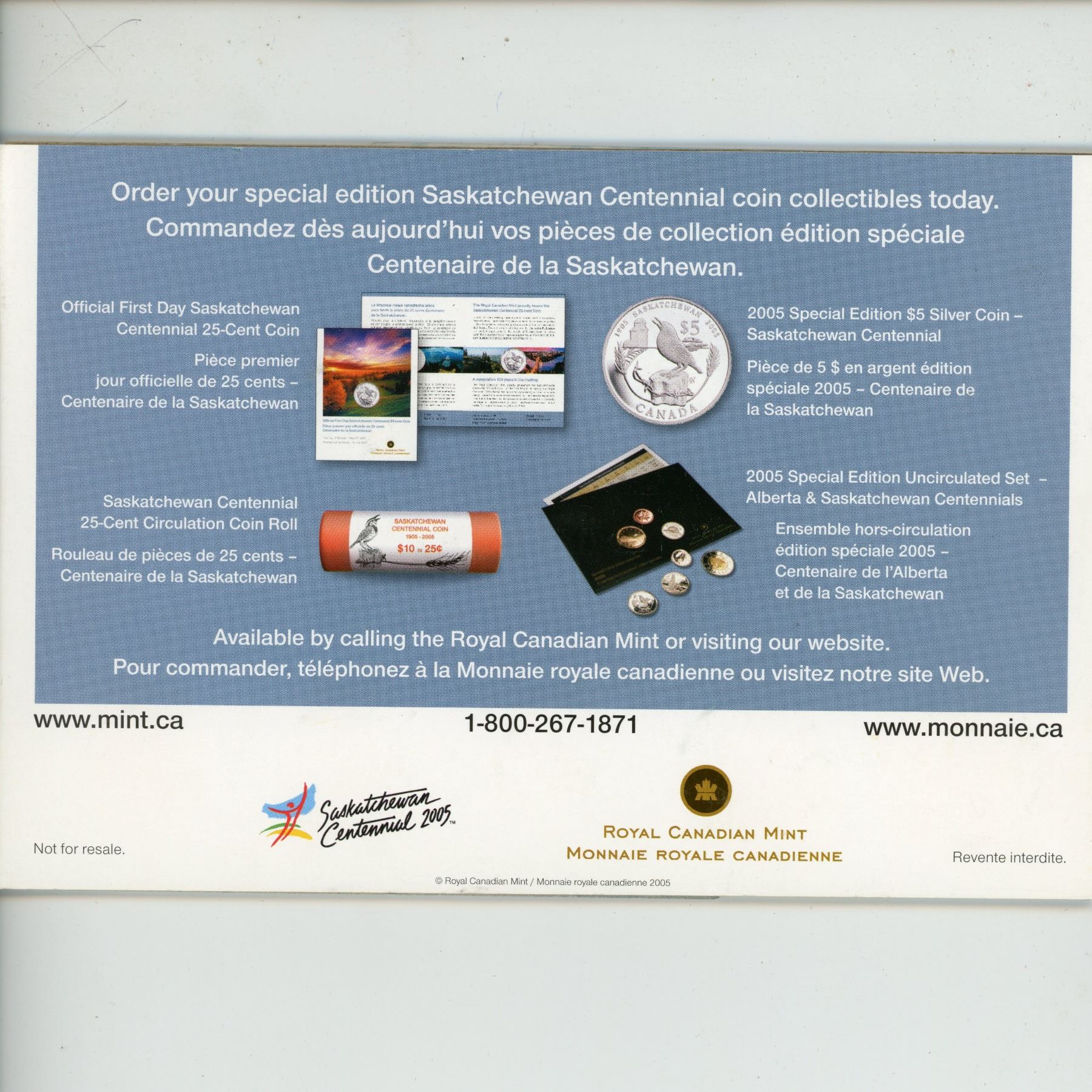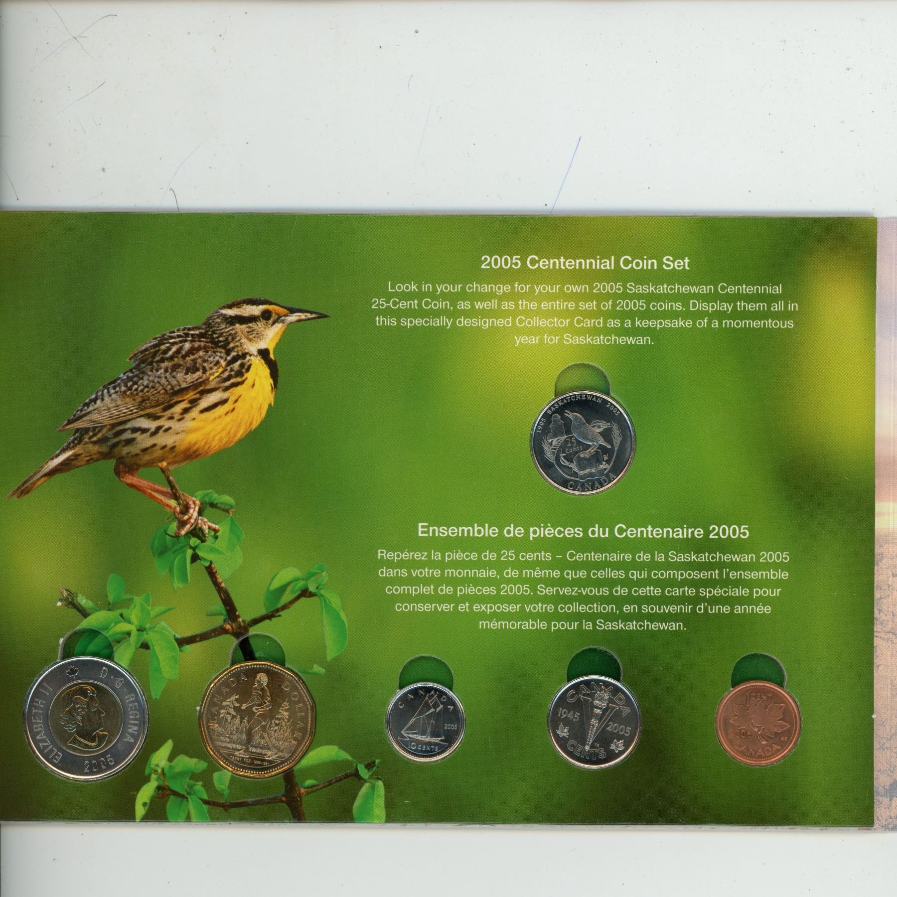 2005 Saskatchewan Centennial Coin Set. 6-coin set includes Saskatchewan 25 Cents, plus a Terry Fox loonie & a Victory nickel. Housed in its original Royal Canadian Mint packaging.