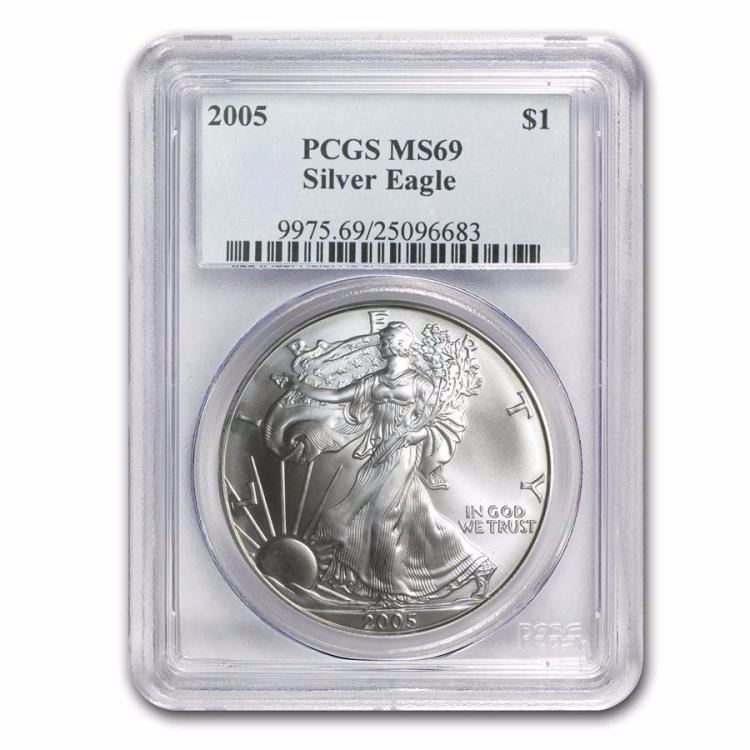 Year|**2005Grade|**MS69Grade Service|**PCGSDenomination|**1Mint Mark|**N/A - PhiladelphiaMetal Content|**1 Troy oz. Purity|**0.999Manufacturer|**US MintThickness|**2.98mmDiameter|**40.6mmInner Pack|**Outer Pack|**