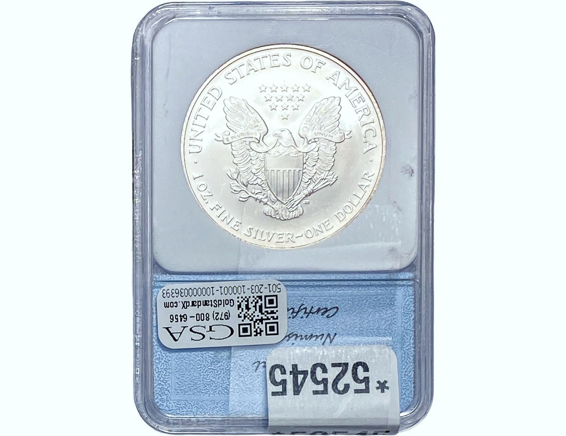 l. All non-certified coins and currency are guaranteed genuine, but are not guaranteed as to grade, since grading is a matter of opinion, an art and not a science, and therefore the description rendered by GSA or any third-party grading service may not agree with the opinion of others (including trained experts), and the same expert may not grade the same item with the same grade at two different times. GSA may, but is not obligated to, express an opinion as to non-certified numismatic items, in GSA’s opinion, or by its employees’ experience and the current interpretation of the American Numismatic Association’s standards as of the date the catalog was prepared. There is no guarantee or warranty expressed or implied that the grading opinions utilized by GSA, if any, will meet the standards of any grading service at any time in the future.