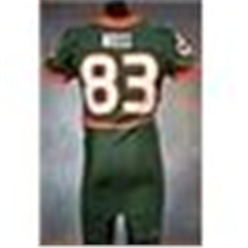 On the front left tail is the "Nike" manufacturers size 40 tag with a "S" flag tag attached. On the bottom outside from collar is the official "Miami U" embroidered logo. On the upper right front is the official "ACC" embroidered logo patch. On the upper left front is the Nike swoosh logo. On the front, back and on each shoulder of the jersey is the player number "83" in white on orange tackle twill. Across the back is "MOSS" in white tackle twill on a green name plate. The jersey has custom elastic sleeves. The jersey shows game-use and appears to have no alterations of any kind.