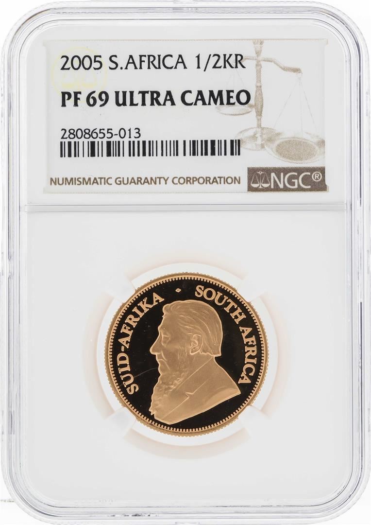 One 2005 South Africa 1/2 Krugerrand Fine Gold Coin NGC PF69 Ultra Cameo. NGC Certified.
