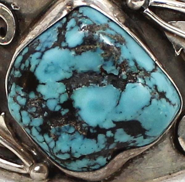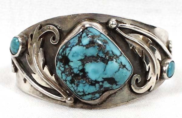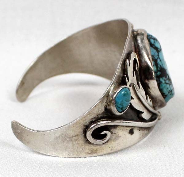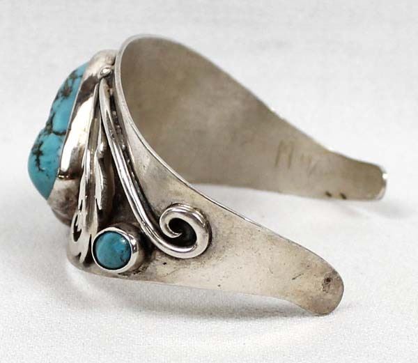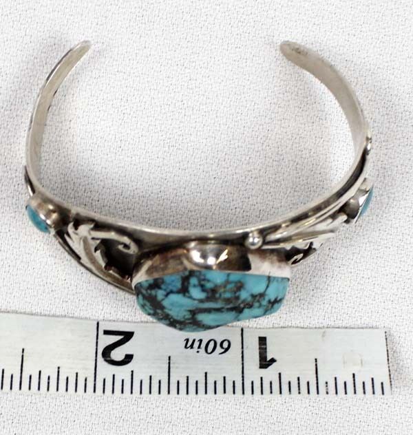 2005 Southwestern Turquoise Cuff Bracelet, inside measures 6'' which includes the gap x 1.5''W, features 3 pieces of beautiful turquoise, the center stone measures 1'' x 1'', the artist has engraved .925, hallmark, and date on the inside of bracelet, bracelet has not been tested and we are unsure if it is truly indeed sterling