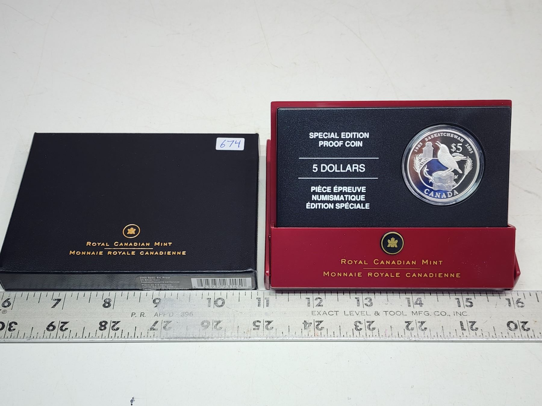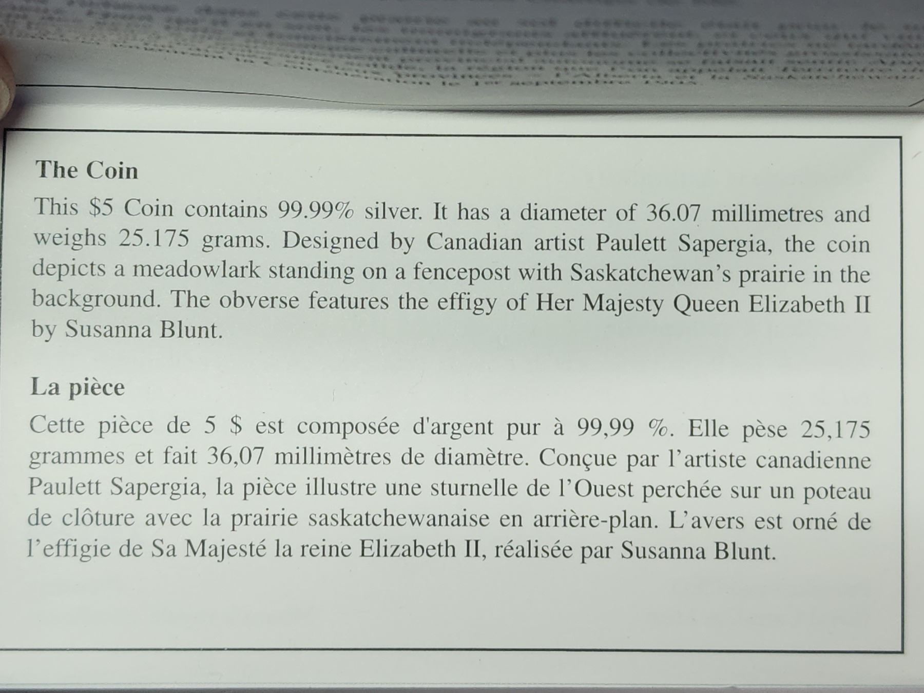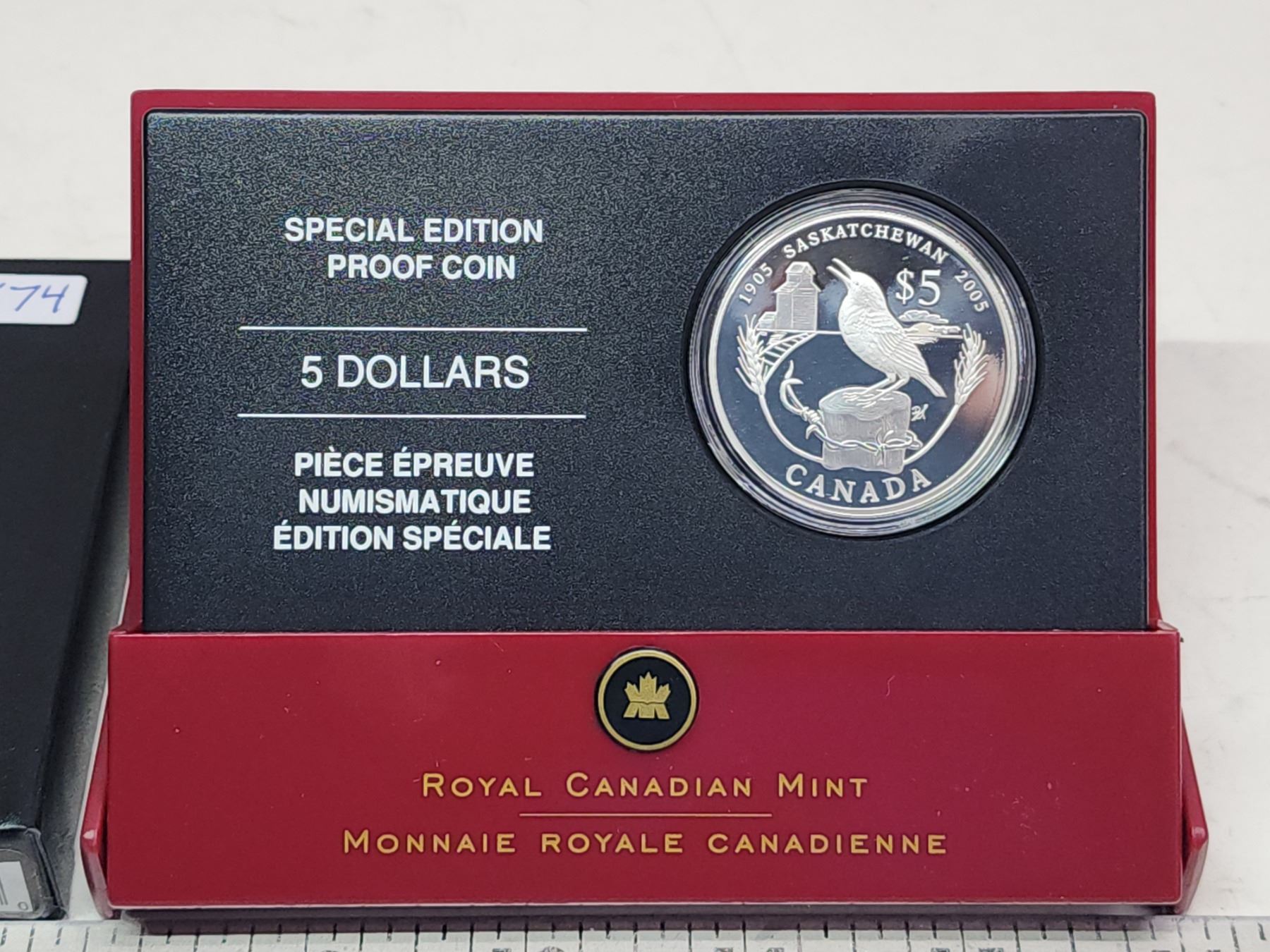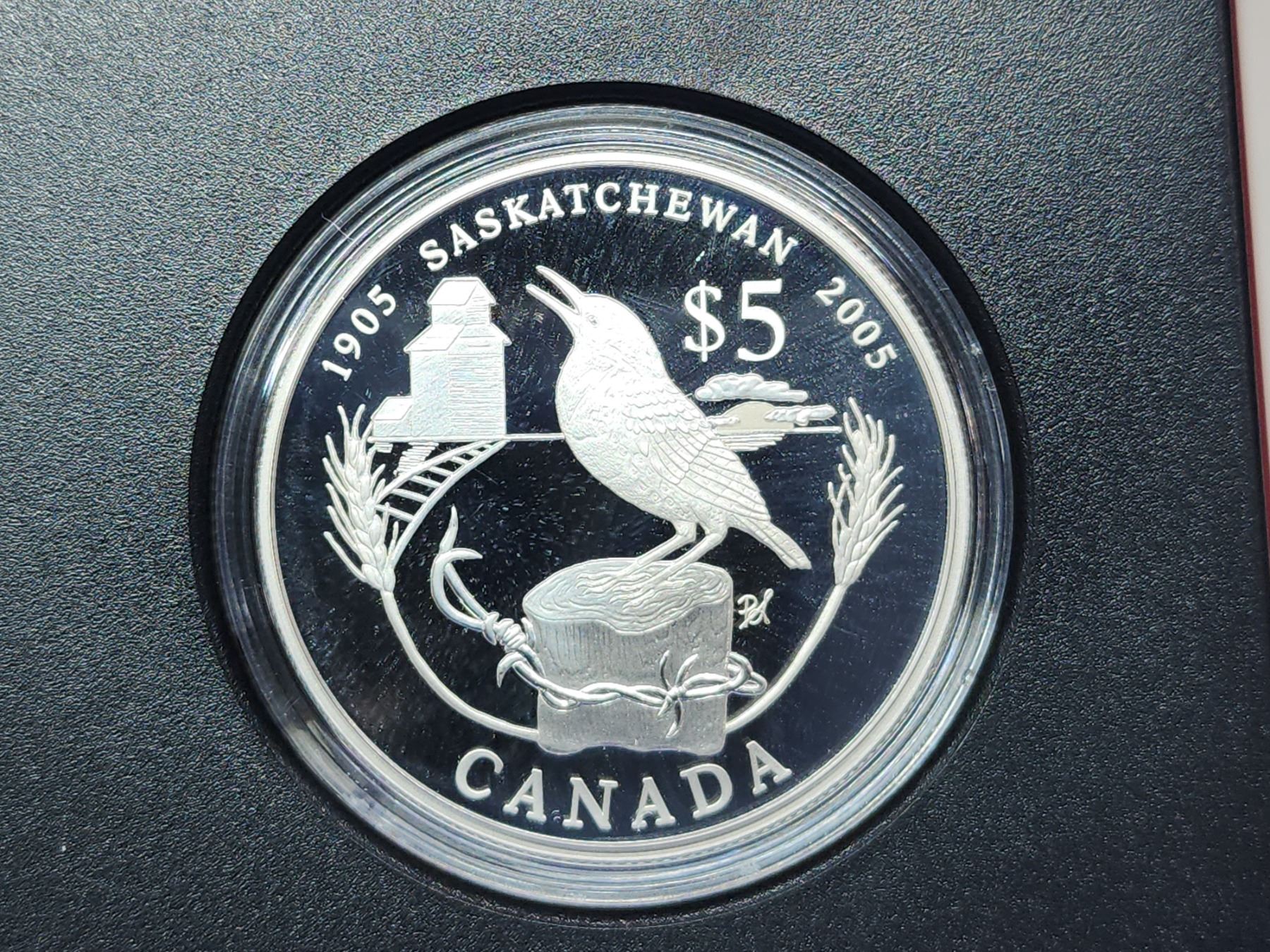 2005 Special Edition Saskatchewan Centennial $5. Proof with Ultra Heavy Cameo. 99.99% pure Silver. Certificate of Authenticity. Housed in its original Royal Canadian Mint case of issue.