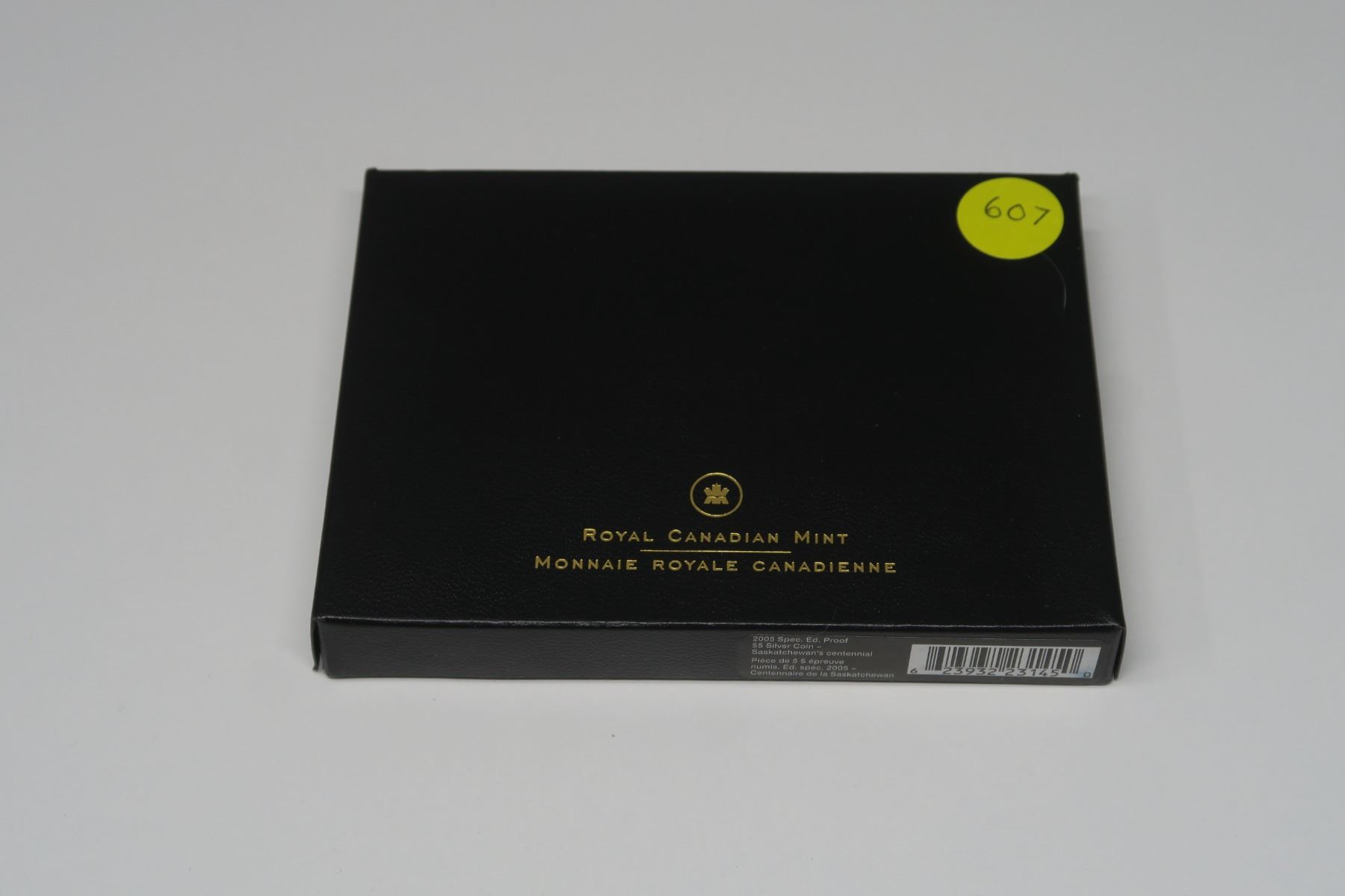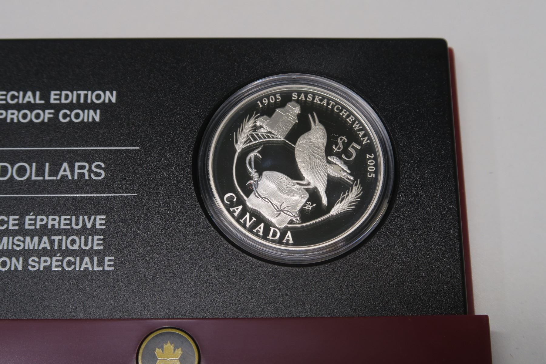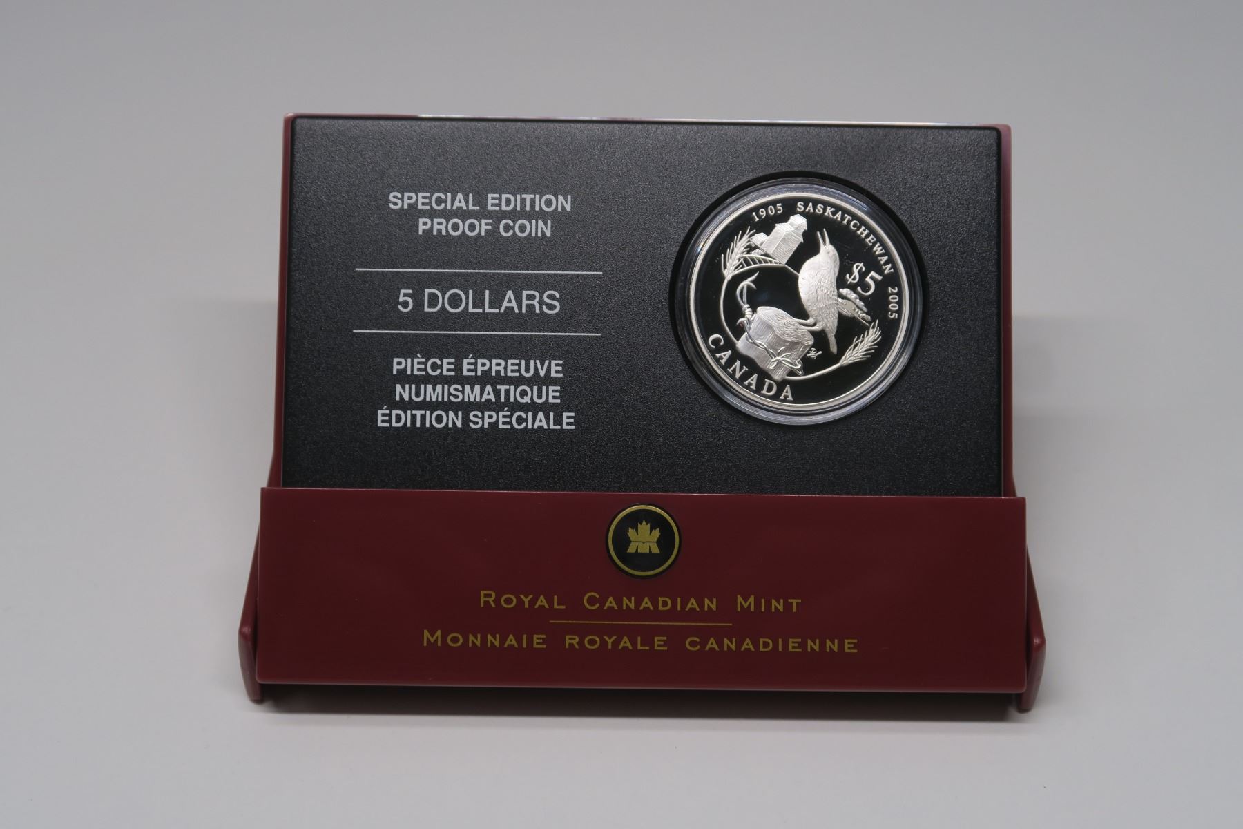 2005 Special Edition Saskatchewan Centennial Silver $5. 100th Anniversary of Saskatchewan joining Canada. Proof. Mintage of 20,000. 99.99 pure Silver. In original case and box of issue.