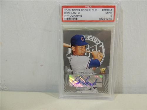 2005 TOPPS #RCRSA GRADED AUTOGRAPH BASEBALL CARD RON SANTO. INCLUDES COA ON BACK OF CARD. GRADED PSA MINT 9. AS SHOWN. VIEW PICTURE FOR DETAIL. PLEASE BE ADVISED, AND INFORMED REGARDING SIGNATURES OR AUTOGRAPHS THAT WE SELL AT AUCTION: WE ARE NOT AUTHENTICATORS, AND WE DO NOT AUTHENTICATE, OR VALIDATE ANY AUTOGRAPHS OR SIGNATURES THAT WE OFFER AT AUCTION. SOME AUTOGRAPHS OR SIGNATURES MAY COME WITH AN AUTHENTICATION FROM ANY ONE OF LITERALLY HUNDREDS OF AUTHENTICATORS ACROSS THE COUNTRY, AND AROUND THE WORLD. WE DO NOT ENDORSE ANY AUTHENTICATOR, NOR DO WE GUARANTEE THAT ANY AUTOGRAPH OR SIGNATURE IS AUTHENTIC, OR THAT IT WILL PASS AUTHENTICATION BY ANY AUTHENTICATOR. ALL AUTOGRAPHS OR SIGNATURES ARE SOLD