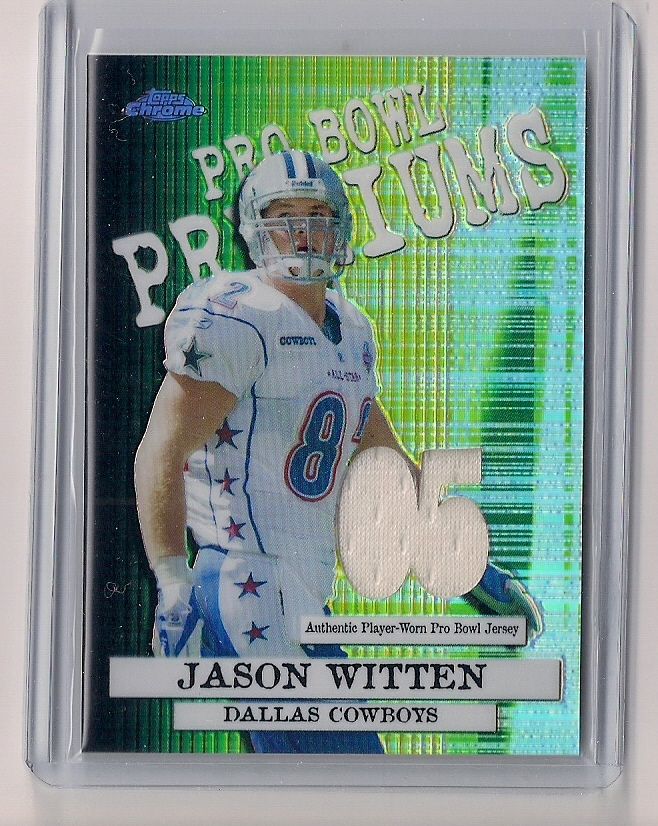 2005 Topps Chrome Refractor Pro Bowl Premiums Jason Witten Player-Worn Pro Bowl Jersey Insert Card. This Insert features a Solid White piece of Player-Worn Pro Bowl Jersey. Card is Near Mint.