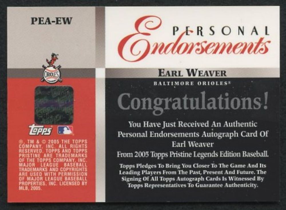 2005 Topps Pristine Legends Personal Endorsements #EW Earl Weaver (Orioles). Please see the scans below for details on the condition of the card.