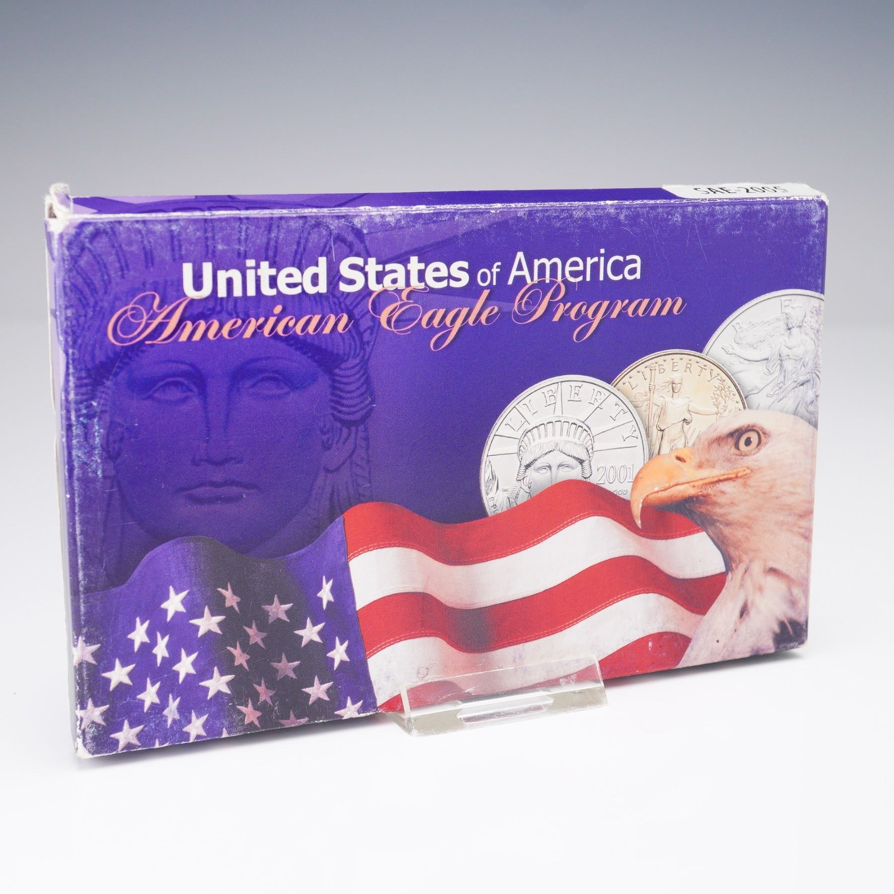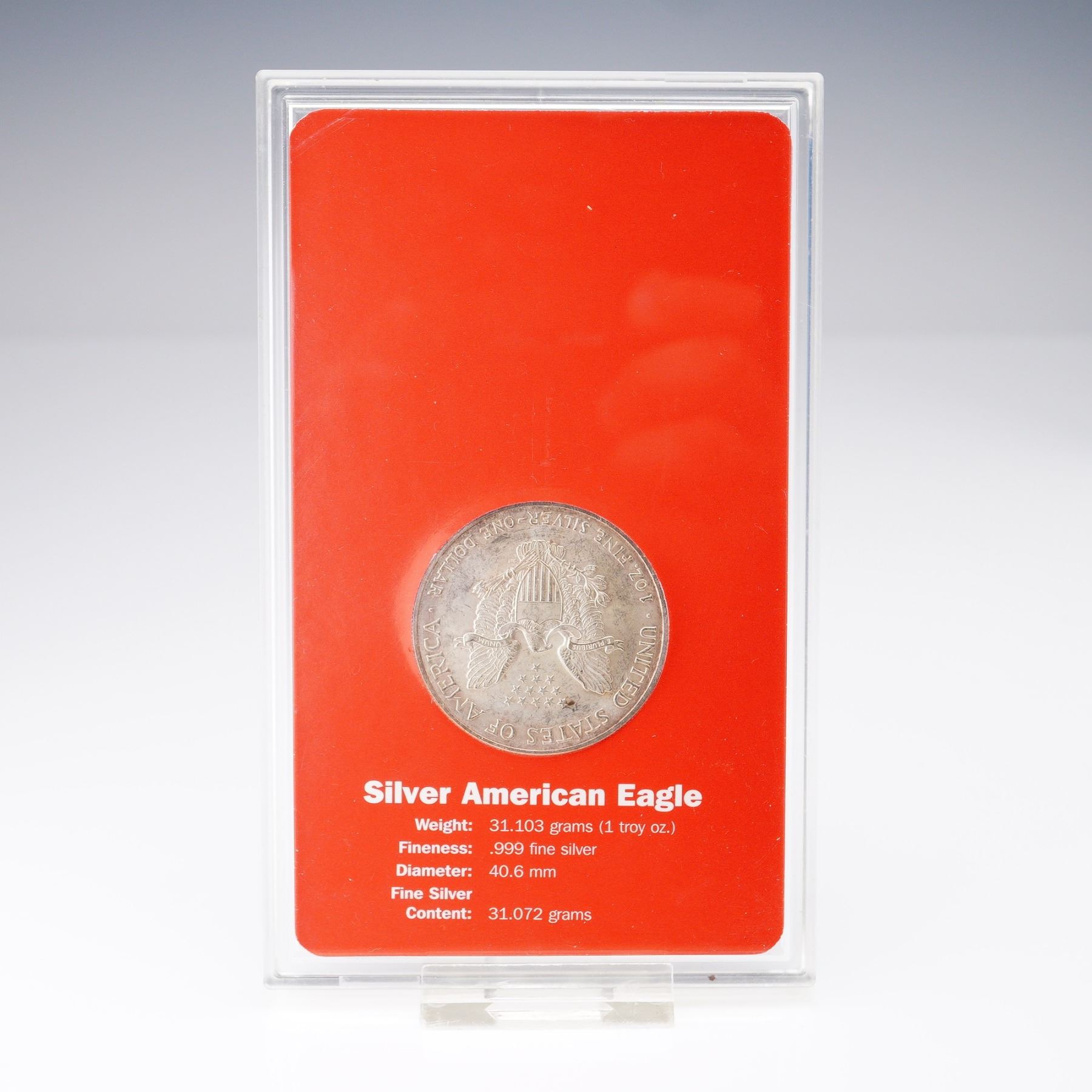 2005 American Eagle one ounce silver bullion coin issued by the United States Mint, consisting of 1 troy ounce (31.103g) of .999 fine silver. Adolph A. Weinman's Walking Liberty graces the obverse, with Liberty enrobed in the Stars and Stripes, hand extended and clutching oak and laurel branches. The reverse shows John Mercanti's heraldic eagle with arrows, olive branch, and thirteen stars. The coin is encapsulated and presented in its original Mint display holder and themed outer packaging from the American Eagle Program. Coin diameter: 40.6mm. U.S. Box: 5.75"L x 3.5"H.