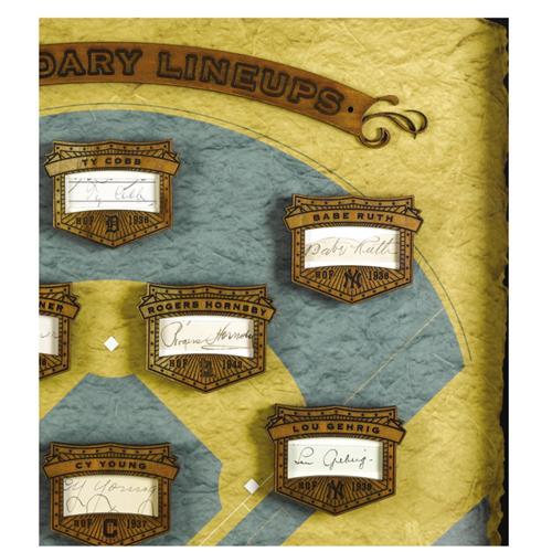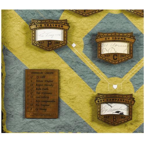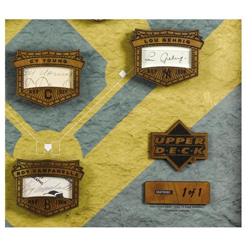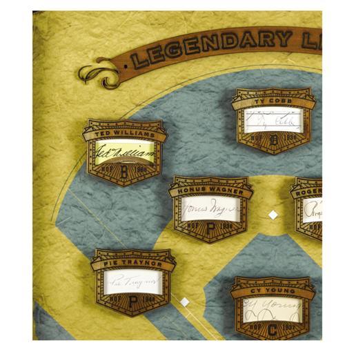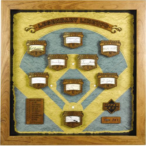 <B>2005 Upper Deck Legendary Lineups 1/1 Redemption Piece.</B></I> There's no question that the hobby of sports card collecting has changed in a fundamental way since the days when a few pennies would buy a wax pack with a stick of gum and a few cards inside. While there are still many collectors who concentrate on set building, the way their fathers and grandfathers once did before them, it is the added excitement of a special "pull," hobby lingo for finding a limited run redemption card, that fuels the market today. Every time a card collector breaks open the packaging of a new purchase, fingers are crossed that something truly special is lurking inside. Like the protagonist in the famous book "Charlie and the Chocolate Factory," everyone is hoping to find Willie Wonka's Golden Ticket.<BR><BR> For our lucky consignor, that dream became a reality when he opened a tin of 2005 Upper Deck Hall Of Fame Baseball Cards and made the hobby's ultimate pull. Tim Muret himself, Vice President of Upper Deck Authenticated, weighed in on the magnitude of this find, saying, "The Upper Deck Authenticated Legendary Lineups autographed framed piece is almost certainly the most unique and valuable redemption piece ever offered by Upper Deck." We'll go a step further and proclaim that this is likely the finest autographed redemption piece in the hobby, bar none. The general public seems to agree with this assessment. At the National Sports Collectors Convention in Anaheim, California in July where the piece was on display, hundreds of collectors salivated over it. Many proclaimed it the most impressive item at the show. Some posed beside it for photographs. One gentleman half-jokingly offered his young son as a trade.<BR><BR> This adoration is clearly justified. The autograph cards that we have seen selling for tens of thousands of dollars pale in comparison to the compilation of elite signatures we find here, and the shadow box design is so artfully rendered that no mere card could possibly compare. Each legendary Hall of Famer is represented with a 10/10 quality cut signature, mounted into a masterfully engraved wooden holder and placed into the proper position on a painted baseball diamond. The roster, organized into a devastating batter order, is listed again on its own wooden engraved plaque at left, with the Upper Deck logo and the all-important "1 of 1" designation appearing at right.<BR><BR> And so, without further ado, we'll turn our attention to the cast of characters that make this piece the best in the hobby. Batting first, in center field, Ty Cobb. Batting second, at shortstop, Honus Wagner. Batting third, at second base, Rogers Hornsby. Batting clean-up, in right field, Babe Ruth. Batting fifth, in left field, Ted Williams. Batting sixth, at first base, Lou Gehrig. Batting seventh, behind the plate, Roy Campanella. Batting eighth, at third base, Pie Traynor. And batting last, with 511 career wins, Cy Young.<BR><BR> The shadow box measures twenty-four inches on each side, and just over three inches deep. All autographs have been authenticated by James Spence, as is detailed on the included Upper Deck certificate of authenticity.