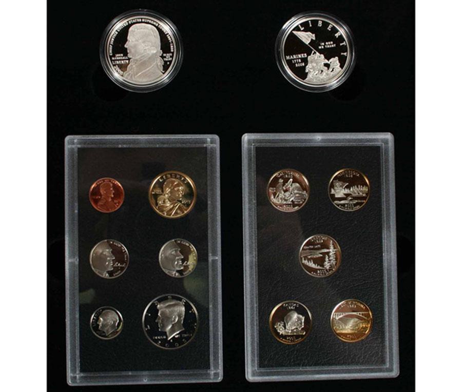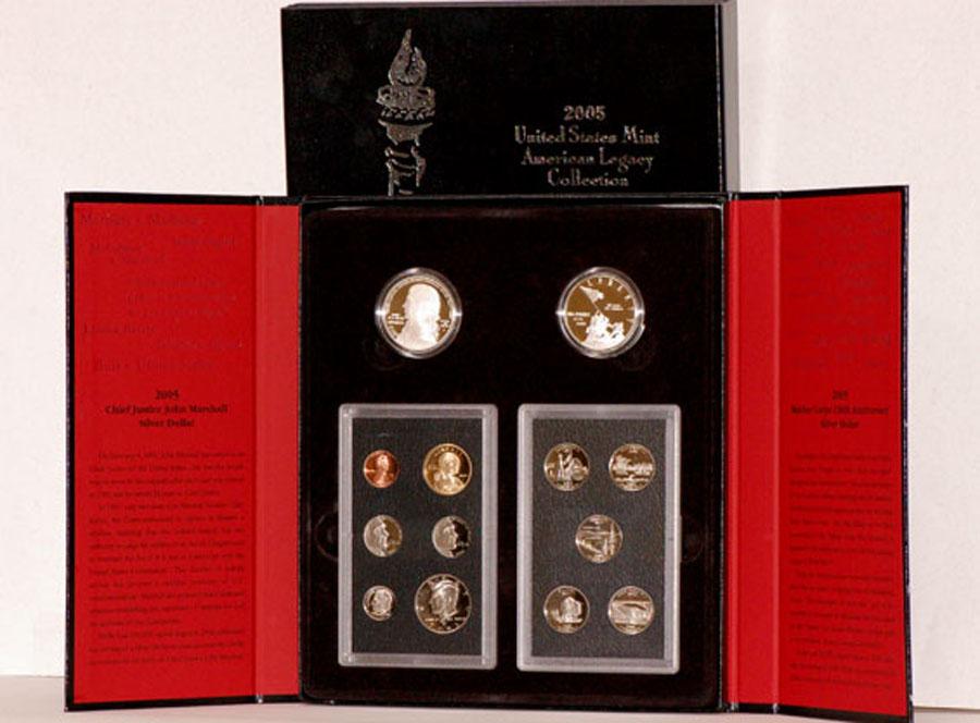 Beautiful and scarce 2005 Legacy Proof Set. The Legacy series only ran for 4 years, 2005-2008. The 2005 set includes the Chief Justice John Marshall Proof $1 Silver Commemorative and the 230th Anniversary Marine Corp Proof Commemorative $1, plus the traditional 2005 Proof Set in a beautiful presentation case. Very hard to find.