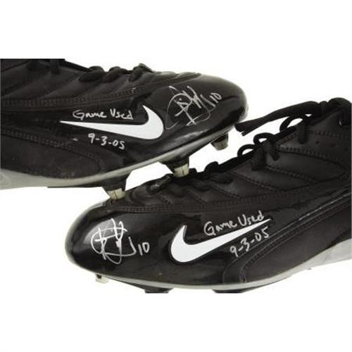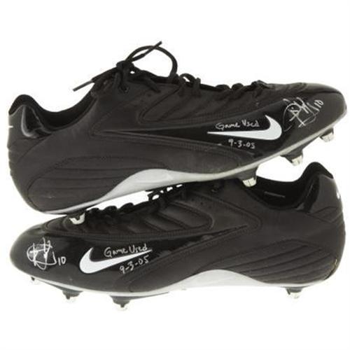 <B>2005 Vince Young Game Worn Cleats.</B></I> Size 13.5 black Nike cleats opened the glorious NCAA Championship season in a sixty to three nail-biter of a University of Texas victory over Louisiana-Lafayette at Darrel K. Royal-Texas Memorial Stadium. This first of thirteen consecutive victories culminating with the thrilling Rose Bowl upset over the heavily-favored USC Trojans saw Young toss three touchdowns and run for another in a first hint of great things to come this season. The cleats show appropriate single-game wear, with each signed in 10/10 silver sharpie at the toes with "Game Used 9-3-05" notations. Acquired from a source within the Longhorns football program. <I>LOA from Lou Lampson. LOA from PSA/DNA (autograph). LOA from James Spence Authentication (autograph).</B></I><BR><BR><b>Shipping:</b> Clothing, Costumes & Jerseys (<a target="_blank" href="http://www.heritageauctions.com/common/shipping.php">view shipping information</a>)