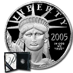 Product ID: 10551 Year: 2005 Grade: Proof Grade Service: None Denomination: $10 Mint Mark: W - West Point Metal Content: 0.1 troy oz Purity: .9995 Manufacturer: U.S. Mint Thickness: .95 mm Diameter: 16.5 mm