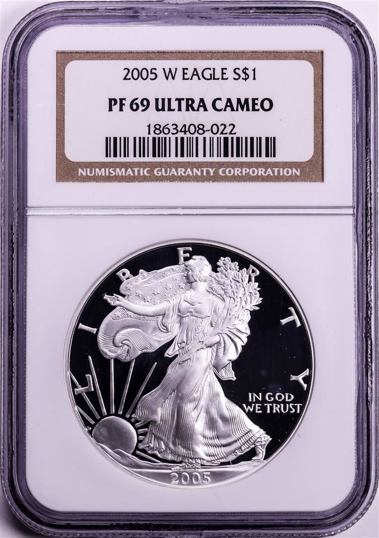One 2005-W $1 Proof American Silver Eagle Coin NGC PF69 Ultra Cameo. NGC Certified.