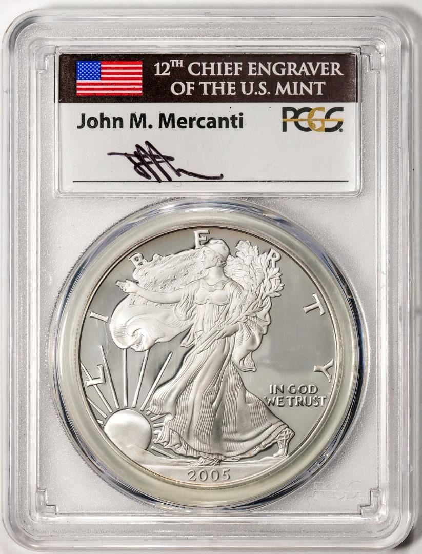 2005-W $1 Proof American Silver Eagle Coin PCGS PR70DCAM Mercanti Signature